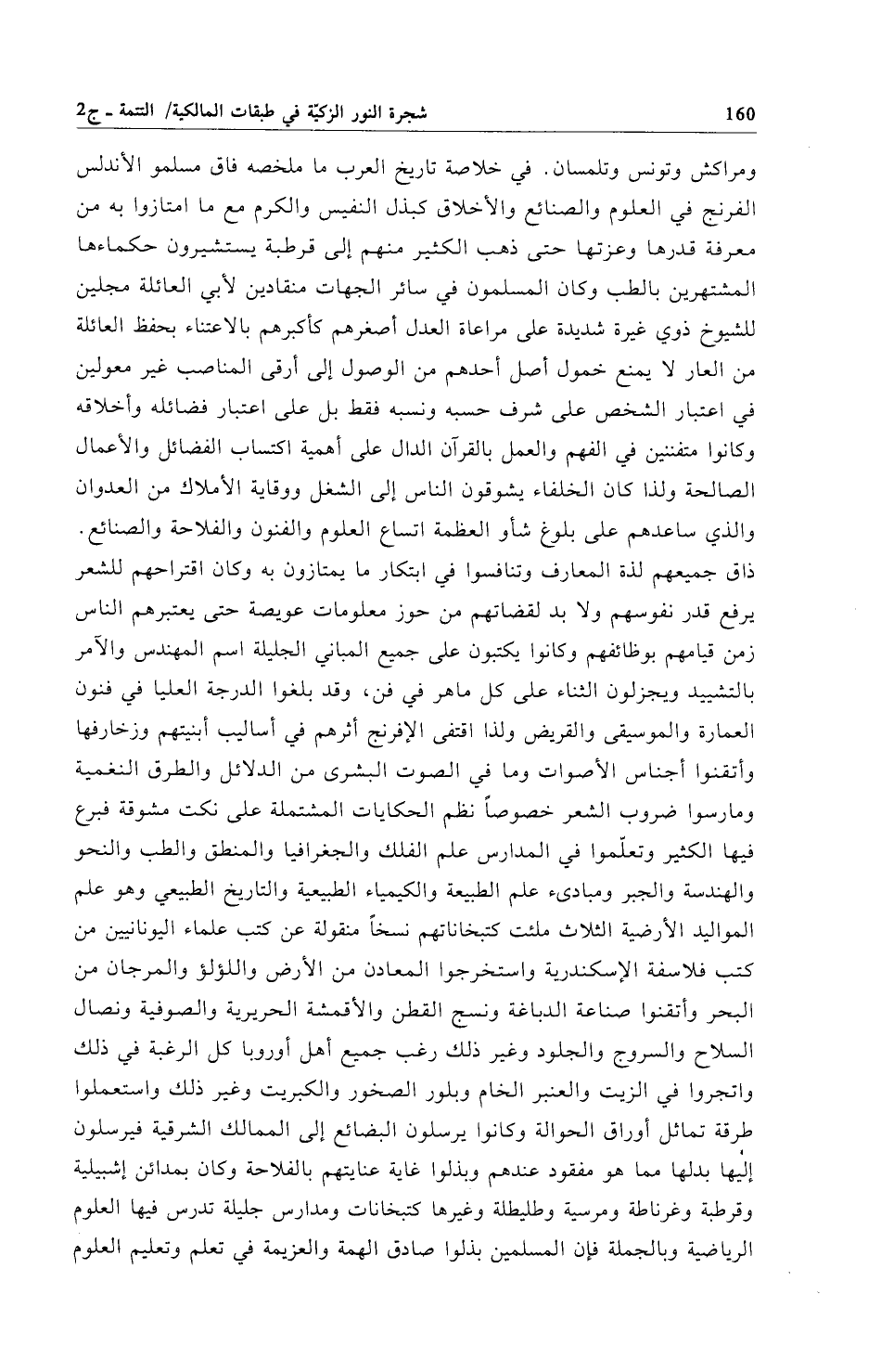 ومراكش وتونس وتلمسان. في خلاصة تاريخ العرب ما ملخصه فاق مسلمو الأندلس الفرنج في العلوم والصنائع والأخلاق كبذل النفيس والكرم مع ما امتازوا به من معرفة قدرها وعزتها حتى ذهب الكثير منهم إلى قرطبة يستشيرون حكماءها المشتهرين بالطب وكان المسلمون في سائر الجهات منقادين لأبي العائلة مجلين للشيوخ ذوي غيرة شديدة على مراعاة العدل أصغرهم كأكبرهم بالاعتناء بحفظ العائلة من العار لا يمنع خمول أصل أحدهم من الوصول إلى أرقى المناصب غير معولين في اعتبار الشخص على شرف حسبه ونسبه فقط بل على اعتبار فضائله وأخلاقه وكانوا متفننين في اللهم والعمل بالقرآن الدال على أهمية اكتساب الفضائل والأعمال الصالحة ولذا كان الخلفاء يشوقون الناس إلى الشغل ووقاية الأملاك من العدوان والذي ساعدهم على بلوغ شأو العظمة اتساع العلوم والفنون والفلاحة والصنائع. ذاق جميعهم لذة المعارف وتنافسوا في ابتكار ما يمتازون به وكان اقتراحهم للشعر يرفع قدر نفوسهم ولا بد لقضاتهم من حوز معلومات عويصة حتى يعتبرهم الناس زمن قيامهم بوظائفهم وكانوا يكتبون على جميع المباني الجليلة اسم المهندس والآمر بالتشييد ويجزلون الثناء على كل ماهر في فن، وقد بلغوا الدرجة العليا في فنون العمارة والموسيقى والقريض ولذا اقتفى الإفرنج أثرهم في أساليب أبنيتهم وزخارفها وأتقنوا أجناس الأصوات وما في الصوت البشرى من الدلائل والطرق النغمية ومارسوا ضروب الشعر خصوصاً نظم الحكايات المشتملة على نكت مشوقة فبرع فيها الكثير وتعلموا في المدارس علم الفلك والجغرافيا والمنطق والطب والنحو والهندسة والجبر ومبادىء علم الطبيعة والكيمياء الطبيعية والتاريخ الطبيعي وهو علم المواليد الأرضية الثلاث ملئت كتبخاناتهم نسخاً منقولة عن كتب علماء اليونانيين من كتب فلاسفة الإسكندرية واستخرجوا المعادن من الأرض واللؤلؤ والمرجان من البحر وأتقنوا صناعة الدباغة ونسج القطن والأقمشة الحريرية والصوفية ونصال السلاح والسروج والجلود وغير ذلك رغب جميع أهل أوروبا كل الرغبة في ذلك واتجروا في الزيت والعنبر الخام وبلور الصخور والكبريت وغير ذلك واستعملوا طرقة تماثل أوراق الحوالة وكانوا يرسلون البضائع إلى الممالك الشرقية فيرسلون إليها بدلها مما هو مفقود عندهم وبذلوا غاية عنايتهم بالفلاحة وكان بمدائن إشبيلية وقرطبة وغرناطة ومرسية وطليطلة وغيرها كتبخانات ومدارس جليلة تدرس فيها العلوم الرياضية وبالجملة فإن المسلمين بذلوا صادق الهمة والعزيمة في تعلم وتعليم العلوم
