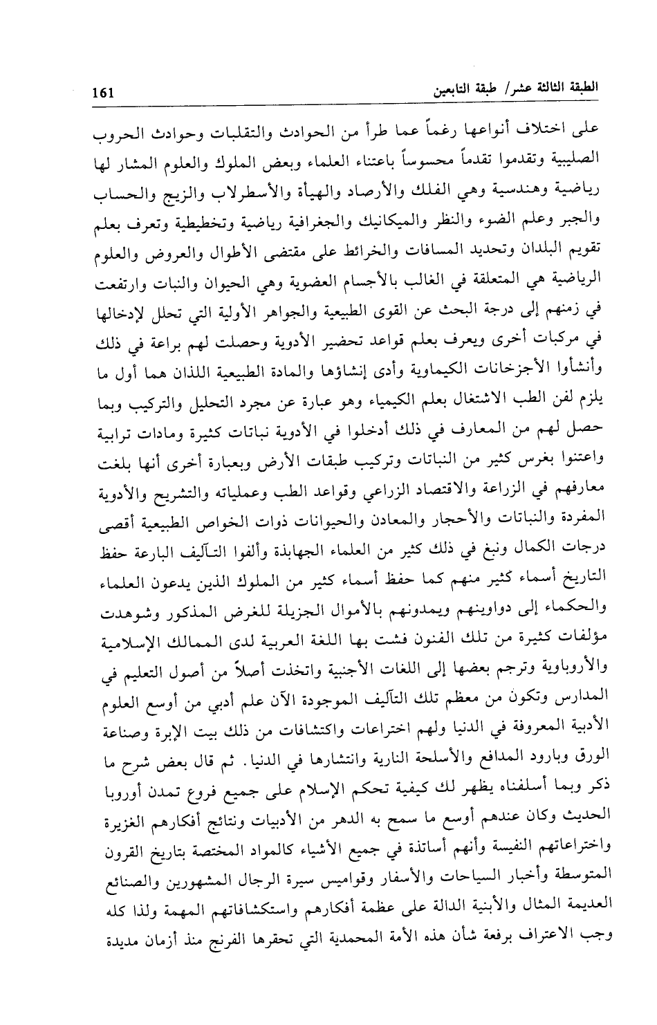على اختلاف أنواعها رغماً عما طرأ من الحوادث والتقلبات وحوادث الحروب الصليبية وتقدموا تقدماً محسوساً باعتناء العلماء وبعض الملوك والعلوم المشار لها رياضية وهندسية وهي الفلك والأرصاد والهيأة والأسطرلاب والزيج والحساب والجبر وعلم الضوء والنظر والميكانيك والجغرافية رياضية وتخطيطية وتعرف بعلم تقويم البلدان وتحديد المسافات والخرائط على مقتضى الأطوال والعروض والعلوم الرياضية هي المتعلقة في الغالب بالأجسام العضوية وهي الحيوان والنبات وارتفعت في زمنهم إلى درجة البحث عن القوى الطبيعية والجواهر الأولية التي تحلل لإدخالها في مركبات أخرى ويعرف بعلم قواعد تحضير الأدوية وحصلت لهم براعة في ذلك وأنشأوا الأجزخانات الكيماوية وأدى إنشاؤها والمادة الطبيعية اللذان هما أول ما يلزم لفن الطب الاشتغال بعلم الكيمياء وهو عبارة عن مجرد التحليل والتركيب وبما حصل لهم من المعارف في ذلك أدخلوا في الأدوية نباتات كثيرة ومادات ترابية واعتنوا بغرس كثير من النباتات وتركيب طبقات الأرض وبعبارة أخرى أنها بلغت معارفهم في الزراعة والاقتصاد الزراعي وقواعد الطب وعملياته والتشريح والأدوية المفردة والنباتات والأحجار والمعادن والحيوانات ذوات الخواص الطبيعية أقصى درجات الكمال ونبغ في ذلك كثير من العلماء الجهابذة وألفوا التآليف البارعة حفظ التاريخ أسماء كثير منهم كما حفظ أسماء كثير من الملوك الذين يدعون العلماء والحكماء إلى دواوينهم ويمدونهم بالأموال الجزيلة للغرض المذكور وشوهدت مؤلفات كثيرة من تلك الفنون فشت بها اللغة العربية لدى الممالك الإِسلامية والأروباوية وترجم بعضها إلى اللغات الأجنبية واتخذت أصلاً من أصول التعليم في المدارس وتكون من معظم تلك التآليف الموجودة الآن علم أدبي من أوسع العلوم الأدبية المعروفة في الدنيا ولهم اختراعات واكتشافات من ذلك بيت الإبرة وصناعة الورق وبارود المدافع والأسلحة النارية وانتشارها في الدنيا. ثم قال بعض شرح ما ذكر وبما أسلفناه يظهر لك كيفية تحكم الإِسلام على جميع فروع تمدن أوروبا الحديث وكان عندهم أوسع ما سمح به الدهر من الأدبيات ونتائج أفكارهم الغزيرة واختراعاتهم النفيسة وأنهم أساتذة في جميع الأشياء كالمواد المختصة بتاريخ القرون المتوسطة وأخبار السياحات والأسفار وقواميس سيرة الرجال المشهورين والصنائع العديمة المثال والأبنية الدالة على عظمة أفكارهم واستكشافاتهم المهمة ولذا كله وجب الاعتراف برفعة شأن هذه الأمة المحمدية التي تحقرها الفرنج منذ أزمان مديدة