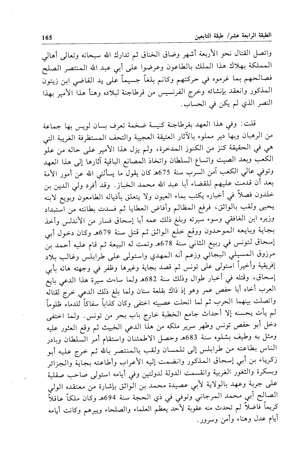 قلت: وفي هذا العهد بقرطاجنة كنيسة ضخمة تعرف بسان لويس بها جماعة من الرهبان وبها دير مملوء بالآثار العتيقة العجيبة والتحف المستظرفة الغريبة التي هي في الحقيقة كنز من الكنوز المدخرة، ولم يزل هذا الأمير على حاله من علو الكتب وبعد الصيت واتساع السلطان واتخاد المصانع الباقية آثارها إلى هذا العهد وتوفي عالي الكتب آمن السرب سنة 675 هـ كان يقول ما يسألني الله عن أمور الأمة بعد أن قدمت عليهم للقضاء أبا عبد الله محمَّد الخباز. وقد أفرد ولي الدين بن خلدون فصلاً في أخباره يكتب بماء العيون ولا يتعلق بأذياله الطامعون وبويع لابنه يحيى ولقب بالواثق، فرفع المظالم وأفاض العطايا ثم فسدت بطانته من استبداد وزيره ابن الغافقي وسوء سيرته وبلغ ذلك عمه أبا إسحاق فسار من الأندلس وأخذ بجاية وبايعه الموحدون ووقع خلع الواثق ثم قتل سنة 679 هـ وكان دخول أبي إسحاق لتونس في ربيع الثاني سنة 678 هـ وتمت له البيعة ثم قام عليه أحمد بن مرزوق المسيلي البجائي وزعم أنه المهدي واستولى على طرابلس وغالب بلاد إفريقية وأخيراً استولى على تونس ثم قصد بجاية وغيرها وظفر في وجهته هاته بأبي إسحاق، وقتله في أخبار طوال وذلك سنة 682 هـ ولما ساءت سيرة هذا الدعي بايع العرب أخاه أبا حفص عمر وهو إذ ذاك بقلعة سنان ولما بلغ ذلك الدعي خرج لقتاله واتصلت بينهما الحرب ثم لما انحلت عصبيته اختفى وكان كذاباً سفاكاً للدماء ظلوماً لم يأت يحسنه إلا أحداث جامع الخطبة خارج باب بحر من تونس. ولما اختفى دخل أبو حفص تونس وطهر سرير ملكه من هذا الدعي الخبيث ثم وقع العثور عليه ومثل به وطيف بشلوه سنة 683 هـ وحصل الاطمئنان واستقام أمر السلطان وبادر الناس بطاعته من طرابلس إلى تلمسان ولقب بالمنتصر بالله ثم خرج عليه أبو زكرياء بن أبي إسحاق المذكور وانضمت إليه الأعراب وأطاعته بجاية والجزائر وبسكرة والثغور الغربية وانقسمت الدولة لدولتين وفي أيامه استولى صاحب صقلية على جربة وعهد بالولاية لأبي عصيدة محمَّد بن الواثق بإشارة من معتقده الولي الصالح أبي محمَّد المرجاني وتوفي في ذي الحجة سنة 694هـ وكان ملكاً عاقلاً كريماً فاضلاً لم تحدث منه عقوبة لأحد يعظم العلماء والصلحاء ويبرهم وكانت أيامه أيام عدل وهناء وأمن وسرور.