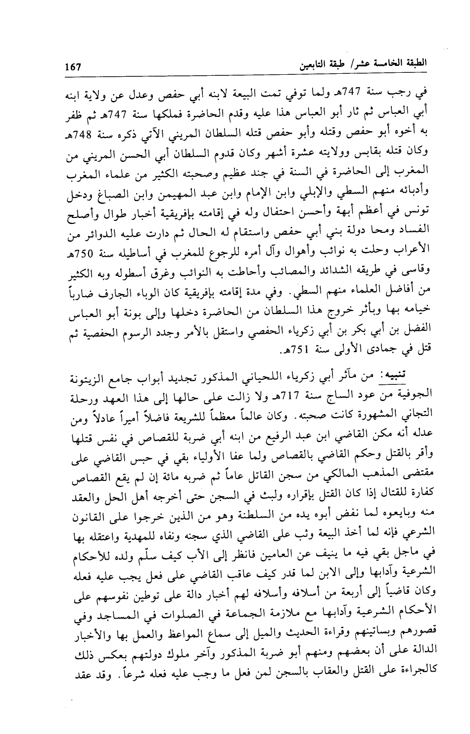 تنبيه: من مآثر أبي زكرياء اللحياني المذكور تجديد أبواب جامع الزيتونة الجوفية من عود الساج سنة 717 هـ ولا زالت على حالها إلى هذا العهد ورحلة التجاني المشهورة كانت صحبته. وكان عالماً معظماً للشريعة فاضلاً أميراً عادلاً ومن عدله أنه مكن القاضي ابن عبد الرفيع من ابنه أبي ضربة للقصاص في نفس قتلها وأقر بالقتل وحكم القاضي بالقصاص ولما عفا الأولياء بقي في حبس القاضي على مقتضى المذهب المالكي من سجن القاتل عاماً ثم ضربه مائة إن لم يقع القصاص كفارة للقتال إذا كان القتل بإقراره ولبث في السجن حتى أخرجه أهل الحل والعقد منه وبايعوه لما نفض أبوه يده من السلطنة وهو من الذين خرجوا على القانون الشرعي فإنه لما أخذ البيعة وثب على القاضي الذي سجنه ونفاه للمهدية واعتقله بها في ماجل بقي فيه ما ينيف عن العامين فانظر إلى الأب كيف سلّم ولده للأحكام الشرعية وآدابها وإلى الابن لما قدر كيف عاقب القاضي على فعل يجب عليه فعله وكان قاضياً إلى أربعة من أسلافه وأسلافه لهم أخبار دالة على توطين نفوسهم على الأحكام الشرعية وآدابها مع ملازمة الجماعة في الصلوات في المساجد وفي قصورهم وبساتينهم وقراءة الحديث والميل إلى سماع المواعظ والعمل بها والأخبار الدالة على أن بعضهم ومنهم أبو ضربة المذكور وآخر ملوك دولتهم بعكس ذلك كالجراءة على القتل والعقاب بالسجن لمن فعل ما وجب عليه فعله شرعاً. وقد عقد