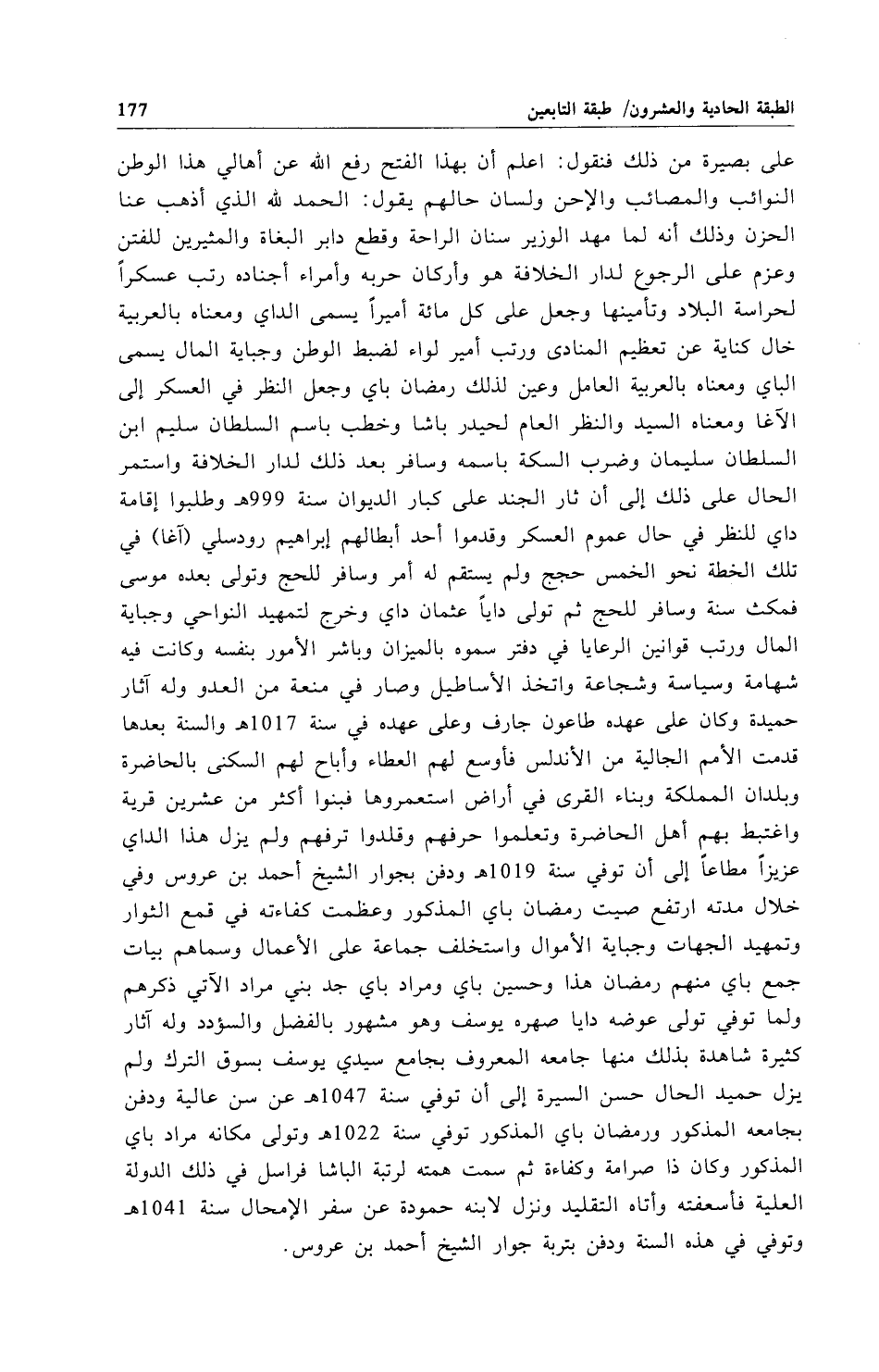 على بصيرة من ذلك فنقول: اعلم أن بهذا الفتح رفع الله عن أهالي هذا الوطن النوائب والمصائب والإحن ولسان حالهم يقول: الحمد لله الذي أذهب عنا الحزن وذلك أنه لما مهد الوزير سنان الراحة وقطع دابر البغاة والمثيرين للفتن وعزم على الرجوع لدار الخلافة هو وأركان حربه وأمراء أجناده رتب عسكراً لحراسة البلاد وتأمينها وجعل على كل مائة أميراً يسمى الداي ومعناه بالعربية خال كناية عن تعظيم المنادى ورتب أمير لواء لضبط الوطن وجباية المال يسمى الباي ومعناه بالعربية العامل وعين لذلك رمضان باي وجعل النظر في العسكر إلى الآغا ومعناه السيد والنظر العام لحيدر باشا وخطب باسم السلطان سليم ابن السلطان سليمان وضرب السكة باسمه وسافر بعد ذلك لدار الخلافة واستمر الحال على ذلك إلى أن ثار الجند على كبار الديوان سنة 999 هـ وطلبوا إقامة داي للنظر في حال عموم العسكر وقدموا أحد أبطالهم إبراهيم رودسلي (آغا) في تلك الخطة نحو الخمس حجج ولم يستقم له أمر وسافر للحج وتولى بعده موسى فمكث سنة وسافر للحج ثم تولى داياً عثمان داي وخرج لتمهيد النواحي وجباية المال ورتب قوانين الرعايا في دفتر سموه بالميزان وباشر الأمور بنفسه وكانت فيه شهامة وسياسة وشجاعة واتخذ الأساطيل وصار في منعة من العدو وله آثار حميدة وكان على عهده طاعون جارف وعلى عهده في سنة 1017 أهـ والسنة بعدها قدمت الأمم الجالية من الأندلس فأوسع لهم العطاء وأباح لهم السكنى بالحاضرة وبلدان المملكة وبناء القرى في أراض استعمروها فبنوا أكثر من عشرين قرية واغتبط بهم أهل الحاضرة وتعلموا حرفهم وقلدوا ترفهم ولم يزل هذا الداي عزيزاً مطاعاً إلى أن توفي سنة 1019هـ ودفن بجوار الشيخ أحمد بن عروس وفي خلال مدته ارتفع صيت رمضان باي المذكور وعظمت كفاءته في قمع الثوار وتمهيد الجهات وجباية الأموال واستخلف جماعة على الأعمال وسماهم بيات جمع باي منهم رمضان هذا وحسين باي ومراد باي جد بني مراد الآتي ذكرهم ولما توفي تولى عوضه دايا صهره يوسف وهو مشهور بالفضل والسؤدد وله آثار كثيرة شاهدة بذلك منها جامعه المعروف بجامع سيدي يوسف بسوق الترك ولم يزل حميد الحال حسن السيرة إلى أن توفي سنة 1047 هـ عن سن عالية ودفن بجامعه المذكور ورمضان باي المذكور توفي سنة 1022هـ وتولى مكانه مراد باي المذكور وكان ذا صرامة وكفاءة ثم سمت همته لرتبة الباشا فراسل في ذلك الدولة العلية فأسعفته وأتاه التقليد ونزل لابنه حمودة عن سفر الإمحال سنة 1041 هـ وتوفي في هذه السنة ودفن بتربة جوار الشيخ أحمد بن عروس.