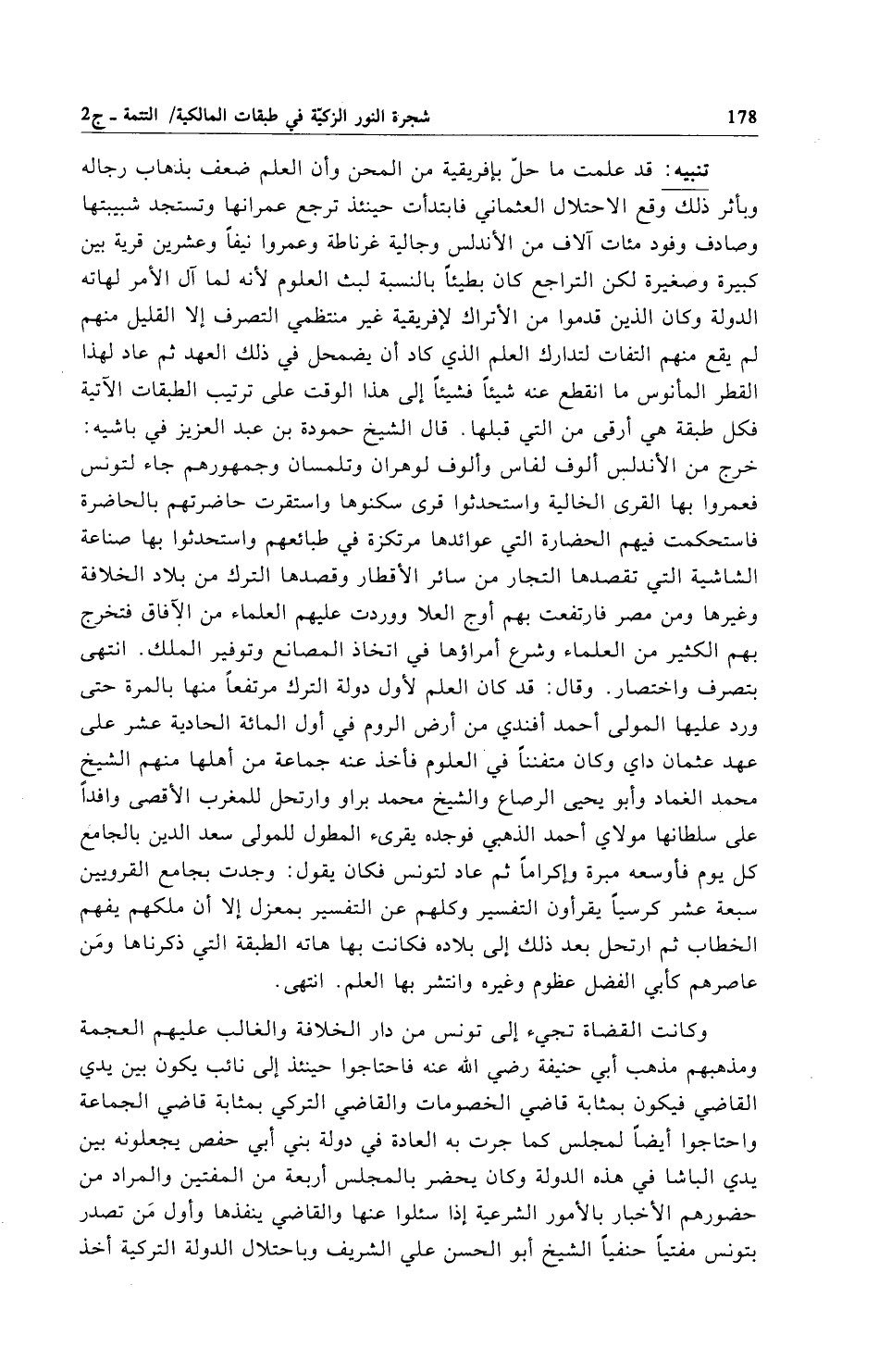 تنبيه: قد علمت ما حلّ بإفريقية من المحن وأن العلم ضعف بذهاب رجاله وبأثر ذلك وقع الاحتلال العثماني فابتدأت حينئذ ترجع عمرانها وتستجد شبيبتها وصادف وفود مئات آلاف من الأندلس وجالية غرناطة وعمروا نيفاً وعشرين قرية بين كبيرة وصغيرة لكن التراجع كان بطيئاً بالنسبة لبث العلوم لأنه لما آل الأمر لهاته الدولة وكان الذين قدموا من الأتراك لإفريقية غير منتظمي التصرف إلا القليل منهم لم يقع منهم التفات لتدارك العلم الذي كاد أن يضمحل في ذلك العهد ثم عاد لهذا القطر المأنوس ما انقطع عنه شيئاً فشيئاً إلى هذا الوقت على ترتيب الطبقات الآتية فكل طبقة هي أرقى من التي قبلها. قال الشيخ حمودة بن عبد العزيز في باشيه: خرج من الأندلس ألوف لفاس وألوف لوهران وتلمسان وجمهورهم جاء لتونس فعمروا بها القرى الخالية واستحدثوا فرى سكنوها واستقرت حاضرتهم بالحاضرة فاستحكمت فيهم الحضارة التي عوائدها مرتكزة في طبائعهم واستحدثوا بها صناعة الشاشية التي تقصدها التجار من سائر الأقطار وقصدها الترك من بلاد الخلافة وغيرها ومن مصر فارتفعت بهم أوج العلا ووردت عليهم العلماء من الآفاق فتخرج بهم الكثير من العلماء وشرع أمراؤها في اتخاذ المصانع وتوفير الملك. انتهى بتصرف واختصار. وقال: قد كان العلم لأول دولة الترك مرتفعاً منها بالمرة حتى ورد عليها المولى أحمد أفندي من أرض الروم في أول المائة الحادية عشر على عهد عثمان داي وكان متفنناً في العلوم فأخذ عنه جماعة من أهلها منهم الشيخ محمَّد الغماد وأبو يحيى الرصاع والشيخ محمَّد براو وارتحل للمغرب الأقصى وافداً على سلطانها مولاي أحمد الذهبي فوجده يقرىء المطول للمولى سعد الدين بالجامع كل يوم فأوسعه مبرة وإكراماً ثم عاد لتونس فكان يقول: وجدت بجامع القرويين سبعة عشر كرسياً يقرأون التفسير وكلهم عن التفسير بمعزل إلا أن ملكهم يفهم الخطاب ثم ارتحل بعد ذلك إلى بلاده فكانت بها هاته الطبقة التي ذكرناها ومَن عاصرهم كأبي الفضل عظوم وغيره وانتشر بها العلم. انتهى.