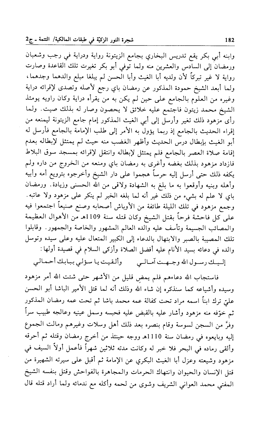 وابنه أبي بكر يقع تدريس البخاري بجامع الزيتونة رواية ودراية في رجب وشعبان ورمضان إلى السادس والعشرين منه ولما توفي أبو بكر تغيرت تلك القاعدة وصارت رواية لا غير تبركاً لأن ولديه أبا الغيث وأبا الحسن لم يبلغا مبلع والدهما وجدهما، ولما أبعد الشيخ حمودة المذكور عن رمضان باي رجع لأصله وتصدى لإقرائه دراية وغيره من العلوم بالجامع على حين لم يكن به من يقرأه دراية وكان راويه يومئذ الشيخ محمَّد زيتون فاجتمع عليه خلائق لا يحصون وصار له بذلك صيت. ولما رأى مزهود ذلك تغير وأرسل إلى أبي الغيث المذكور إمام جامع الزيتونة ليمنعه من إقراء الحديث بالجامع إذ ربما يؤول به الأمر إلى طلب الإمامة بالجامع فأرسل له أبو الغيث بإبطال درس الحديث وأظهر الغضب منه حيث لم يمتثل لإبطاله بعدم إقامة صلاة العصر بالجامع فلم يمتثل لإبطاله وانتقل لإقرائه بمسجد سوق البلاط فازداد مزهود بذلك بغضه وأغرى به رمضان باي ومنعه من الخروج من داره ولم يكفه ذلك حتى أرسل إليه حرساً هجموا على دار الشيخ وأخرجوه بترويع أمه وأبيه وأهله وبنيه وأوقعوا به ما بلغ به الشهادة ولاقى من الله الحسنى وزيادة. ورمضان باي لا علم له بشيء من ذلك غير أنه لما بلغه الخبر لم ينكر على مزهود ولا عاتبه. وجمع مزهود في تلك الليلة طائفة من الأوباش أصحابه وصنع صنيعاً اجتمعوا فيه على كل فاحشة فرحاً بقتل الشيخ وكان قتله سنة 1109 هـ من الأهوال العظيمة والمصائب الجسيمة وتأسف عليه والده العالم المشهور والخاصة والجمهور. وقابلوا تلك المصيبة بالصبر والابتهال بالدعاء إلى الكبير المتعال عليه وعلى سيده وتوسل والده في دعائه بسيد الأنام عليه أفضل الصلاة وأزكى السلام في قصيدة أولها: