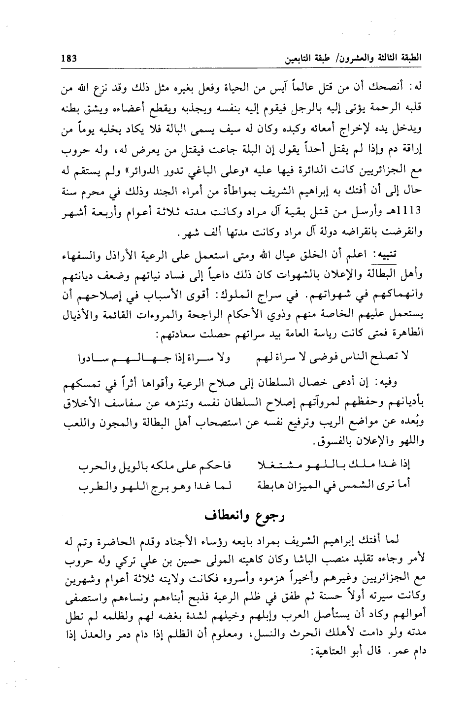 وفيه: إن أدعى خصال السلطان إلى صلاح الرعية وأقواها أثراً في تمسكهم بأديانهم وحفظهم لمروآتهم إصلاح السلطان نفسه وتنزهه عن سفاسف الأخلاق وبُعده عن مواضع الريب وترفيع نفسه عن استصحاب أهل البطالة والمجون واللعب واللهو والإعلان بالفسوق.