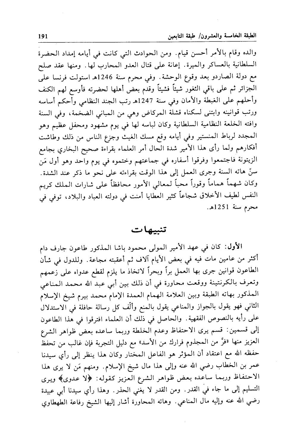 والده وقام بالأمر أحسن قيام. ومن الحوادث التي كانت في أيامه إمداد الحضرة السلطانية بالعساكر والميرة. إعانة على قتال العدو المحارب لها. ومنها عقد صلح مع دولة الصاردو بعد وقوع الوحشة. وفي محرم سنة 1246هـ استولت فرنسا على الجزائر ثم على باقي الثغور شيئاً فشيئاً وقدم بعض أهلها لحضرته فأوسع لهم الكنف وأحلهم على الغبطة والأمان وفي سنة 1247هـ رتب الجند النظامي وأحكم أساسه ورتب قوانينه وابتنى لسكناه قشلة المركاض وهي من المباني الضخمة، وفي السنة وافته الخلعة النظامية السلطانية وكان لباسه لها في يوم مشهود ومحفل عظيم وهو المجدد لرباط المنستير وفي أيامه وقع مسك الغيث وجزع الناس من ذلك وطاشت أفكارهم ولما رأى هذا الأمير شدة الحال أمر العلماء بقراءة صحيح البخاري بجامع الزيتونة فاجتمعوا وفرقوا أسفاره في جماعتهم وختموه في يوم واحد وهو أول مَن سنّ هاته السنة وجرى العمل إلى هذا الوقت بقراءته على نحو ما ذكر عند الشدة. وكان شهماً هماماً وقوراً محباً لمعالي الأمور محافظاً على شارات الملك كريم النفس لطيف الأخلاق شجاعاً كثير العطايا أمنت في دولته العباد والبلاد، توفي في محرم سنة 1251هـ.