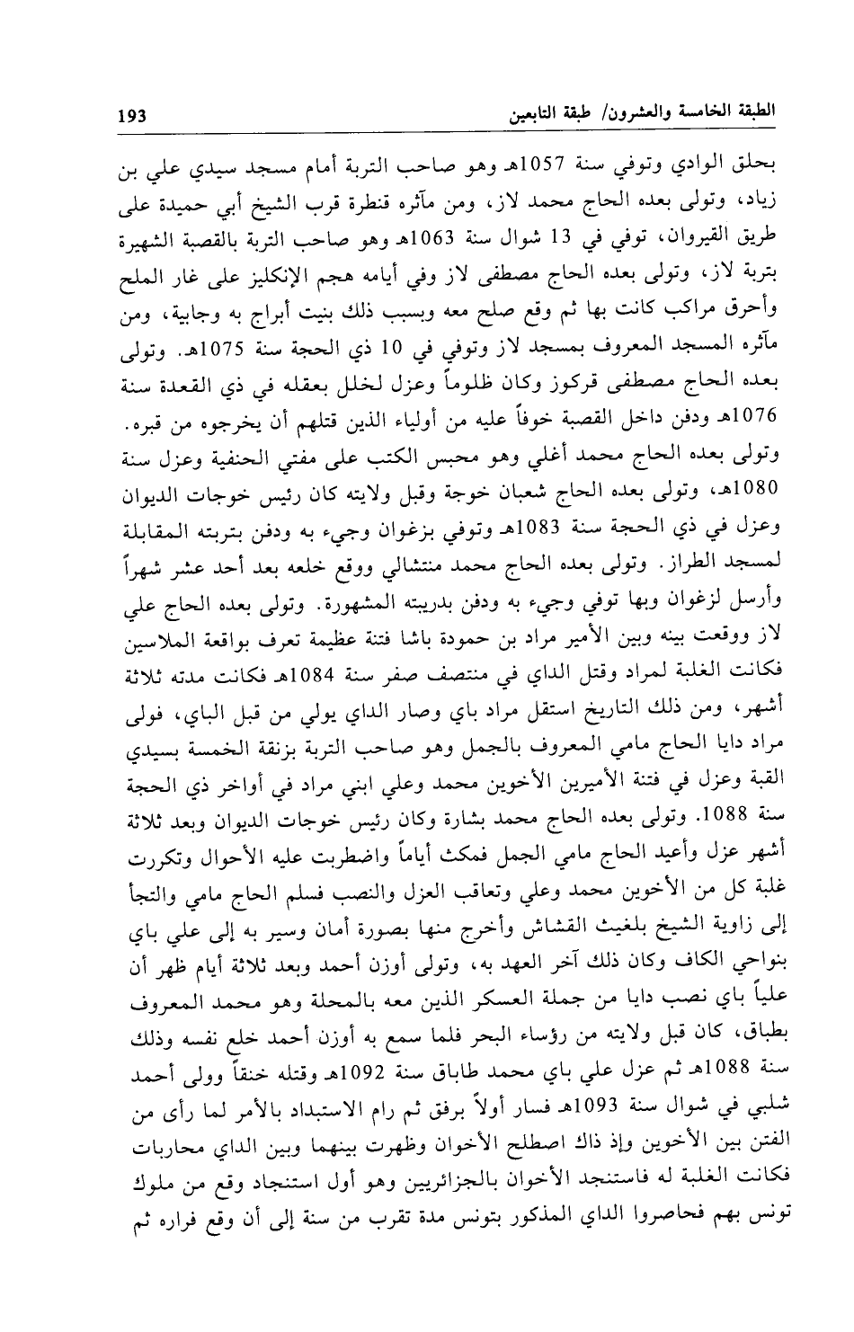 بحلق الوادي وتوفي سنة 1057هـ وهو صاحب التربة أمام مسجد سيدي علي بن زياد، وتولى بعده الحاج محمد لاز، ومن مآثره قنطرة قرب الشيخ أبي حميدة على طريق القيروان، توفي في 13 شوال سنة 1063هـ وهو صاحب التربة بالقصبة الشهيرة بتربة لاز، وتولى بعده الحاج مصطفى لاز وفي أيامه هجم الإنكليز على غار الملح وأحرق مراكب كانت بها ثم وقع صلح معه وبسبب ذلك بنيت أبراج به وجابية، ومن مآثره المسجد المعروف بمسجد لاز وتوفي في 10 ذي الحجة سنة 1075هـ. وتولى بعده الحاج مصطفى قركوز وكان ظلوماً وعزل لخلل بعقله في ذي القعدة سنة 1076هـ ودفن داخل القصبة خوفاً عليه من أولياء الذين قتلهم أن يخرجوه من قبره. وتولى بعده الحاج محمد أغلي وهو محبس الكتب على مفتي الحنفية وعزل سنة 1080هـ، وتولى بعده الحاج شعبان خوجة وقبل ولايته كان رئيس خوجات الديوان وعزل في ذي الحجة سنة 1083هـ وتوفي بزغوان وجيء به ودفن بتربته المقابلة لمسجد الطراز. وتولى بعده الحاج محمد منتشالي ووقع خلعه بعد أحد عشر شهراً وأرسل لزغوان وبها توفي وجيء به ودفن بدريبته المشهورة. وتولى بعده الحاج علي لاز ووقعت بينه وبين الأمير مراد بن حمودة باشا فتنة عظيمة تعرف بواقعة الملاسين فكانت الغلبة لمراد وقتل الداي في منتصف صفر سنة 1084هـ فكانت مدته ثلاثة أشهر، ومن ذلك التاريخ استقل مراد بأي وصار الداي يولي من قبل الباي، فولى مراد دايا الحاج مامي المعروف بالجمل وهو صاحب التربة بزنقة الخمسة بسيدي القبة وعزل في فتنة الأميرين الأخوين محمد وعلي ابني مراد في أواخر ذي الحجة سنة 1088. وتولى بعده الحاج محمد بشارة وكان رئيس خوجات الديوان وبعد ثلاثة أشهر عزل وأعيد الحاج مامي الجمل فمكث أياماً واضطربت عليه الأحوال وتكررت غلبة كل من الأخوين محمد وعلي وتعاقب العزل والنصب فسلم الحاج مامي والتجأ إلى زاوية الشيخ بلغيث القشاش وأخرج منها بصورة أمان وسير به إلى علي باي بنواحي الكاف وكان ذلك آخر العهد به، وتولى أوزن أحمد وبعد ثلاثة أيام ظهر أن علياً باي نصب دايا من جملة العسكر الذين معه بالمحلة وهو محمد المعروف بطباق، كان قبل ولايته من رؤساء البحر فلما سمع به أوزن أحمد خلع نفسه وذلك سنة 1088هـ ثم عزل علي باي محمد طاباق سنة 1092هـ وقتله خنقاً وولى أحمد شلبي في شوال سنة 1093هـ فسار أولاً برفق ثم رام الاستبداد بالأمر لما رأى من الفتن بين الأخوين وإذ ذاك اصطلح الأخوان وظهرت بينهما وبين الداي محاربات فكانت الغلبة له فاستنجد الأخوان بالجزائريين وهو أول استنجاد وقع من ملوك تونس بهم فحاصروا الداي المذكور بتونس مدة تقرب من سنة إلى أن وقع فراره ثم