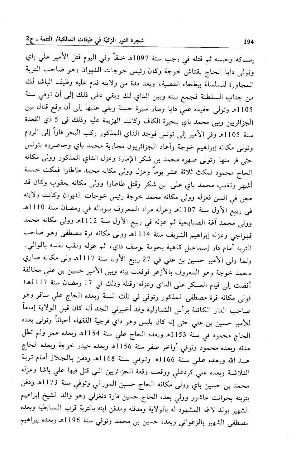 إمساكه وحبسه ثم قتله في رجب سنة 1097هـ خنقاً وفي اليوم قتل الأمير علي باي وتولى دايا الحاج بقتاش خوجة وكان رئيس خوجات الديوان وهو صاحب التربة المجاورة للسلسلة ببطحاء القصبة، وبعد مدة من ولايته قدم عليه وظيف الباشا لك من جناب السلطنة فجمع بينه وبين الداي لك وبقي على ذلك إلى أن توفي سنة 1105هـ وتولى حفيده علي دايا وسار سيرة حسنة وبقي عليها إلى أن وقع قتال بين الجزائريين وبين محمد باي ببحيرة الكاف وكانت الهزيمة عليه وذلك في 5 ذي القعدة سنة 1105هـ وفر الأمير إلى تونس فوجد الداي المذكور ركب البحر فاراً إلى الروم وتولى مكانه إبراهيم خوجة وأعاد الجزائريون محاربة محمد باي وحاصروه بتونس حتى فر منها وتولى صهره محمد بن شكر الإمارة وعزل الداي المذكور وولى مكانه الحاج محمود فمكث ثلاثة عشر يوماً وعزل وولى مكانه محمد طاطارا فمكث خمسة أشهر وتغلب محمد باي على ابن شكر وقتل طاطارا وولى مكانه يعقوب وكان قد طعن في السنن فعزله وولى مكانه محمد خوجة رئيس خوجات الديوان وكانت ولايته في ربيع الأول سنة 1107هـ وعزله مراد المعروف ببوباله في رمضان سنة 1110هـ وولى محمد آغة الصبايحية ثم عزله في ربيع الأول سنة 1112هـ وولى مكانه محمد قهواجي وعزله إبراهيم الشريف سنة 1114هـ وولى مكانه قرة مصطفى وهو صاحب التربة أمام دار إسماعيل كاهية بحومة يوسف داي، ثم عزله ولقب نفسه بالوالي. ولما ولى الأمير حسين بن علي في 27 ربيع الأول سنة 1117هـ ولي مكانه صاري محمد خوجة وهو المعروف بالأزعر فوقعت بينه وبين الأمير حسين بن علي مخالفة أفضت إلى قيام العسكر على الداي وعزله وقتله وذلك في 17 رمضان سنة 1117هـ؛ فولى مكانه قرة مصطفى المذكور وتوفي في تلك السنة وبعده الحاج علي سافر وهو صاحب الدار الكائنة برأس الشبارلية وقد أخبرني الجد أنه كان قبل الولاية إماماً للأمير حسين بن علي حتى إنه كان يلبس وهو داي فرجية الفقهاء أحياناً وتولى بعده الحاج محمود في سنة 1153هـ وبعده الحاج علي سنة 1154هـ وبعده عمر ولم تطل مدته وبعده محمود وتوفي أواخر صفر سنة 1156هـ وبعده حيدر خوجة وبعده الحاج عبد الله وبعده علي سنة 1166هـ وتوفي سنة 1168هـ ودفن بالجلاز أمام تربة القلاشنة وبعده علي كردغلي ووقعت وقعة الجزائريين التي قتل فيها علي باشا وعزله محمد بن حسين باي وولى مكانه الحاج حسين المورالي وتوفي سنة 1173هـ ودفن بتربته بحوانت عاشور وولي بعده الحاج حسين قارة دنغزلي وهو والد الشيخ إبراهيم الشهير بولد لاغه المشهود له بالولاية ومدفنه ومدفن ابنه بالتربة قرب السبابطية وبعده مصطفى الشهير بالزغواني وبعده حسين بن محمد وتوفي سنة 1196هـ وبعده إبراهيم
