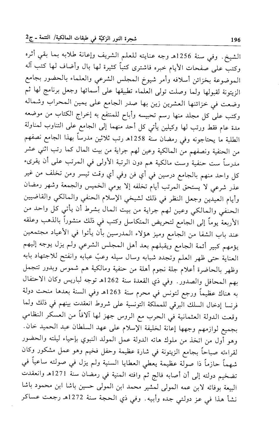 الشيخ. وفي سنة 1256هـ وجه عنايته للعلم الشريف وإعانة طلابه بما بقي أثره وكتب على صفحات الأيام خبره فاشترى كتباً كثيرة لها بال وأضاف لها كتب آله الموضوعة بخزائن أسلافه وأمر شيوخ المجلس الشرعي والعلماء بالحضور بجامع الزيتونة لقبولها ولما وصلت تولى العلماء تطبيقها على أسمائها وجعل برنامج لها ثم وضعت في خزائنها العشرين زين بها صدر الجامع على يمين المحراب وشماله وكتب على كل مجلد منها رسم تحبيسه وأباح للمنتفع به إخراج الكتاب من موضعه مدة عام فقط ورتب لها وكيلين يأتي كل أحد منهما إلى الجامع على التناوب لمناولة الطلبة ما يحتاجونه وفي رمضان سنة 1258هـ رتب ثلاثين مدرساً بهذا الجامع نصفهم من الحنفية ونصفهم من المالكية وعين لهم جراية من بيت المال كما رتب اثني عشر مدرساً ست حنفية وست مالكية هم دون الرتبة الأولى في المرتب على أن يقرىء كل واحد منهم بالجامع درسين في أي فن وفي أي وقت تيسر ومن تخلف من غير عذر شرعي لا يستحق المرتب أيام تخلفه إلا يومي الخميس والجمعة وشهر رمضان وأيام العيدين وجعل النظر في ذلك لشيخي الإِسلام الحنفي والمالكي والقاضيين الحنفي والمالكي وعين لهم جراية من بيت المال بشرط أن يأتي كل واحد من الأربعة يوماً إلى الجامع لتحريض المتكاسل وكتب في ذلك منشوراً بالذهب وعلقه عند باب الشفا من الجامع وميز هؤلاء المدرسين بأن يأتوا في الأعياد مجتمعين يؤمهم كبير أئمة الجامع ويقبلهم بعد أهل المجلس الشرعي ولم يزل يوجه إليهم العناية حتى ظهر العلم وتجدد شبابه وسال سيله وعبّ عبابه وانفتح للاجتهاد بابه وظهر بالحاضرة أعلام جلة نجوم أهلة من حنفية ومالكية هم شموس ويدور تتجمل بهم المحافل والصدور. وفي ذي القعدة سنة 1262هـ توجه لباريس وكان الاحتفال به هناك عظيماً ورجع لتونس في محرم سنة 1263هـ وفي السنة بعدها منحت دولة فرنسا إدخال السلك البرقي للمملكة التونسية على شروط انعقدت بينهم في ذلك ولما وقعت الدولة العثمانية في الحرب مع الروس جهز لها آلافاً من العسكر النظامي بجميع لوازمهم وجهها إعانة لخليفة الإِسلام على عهد السلطان عبد الحميد خان. وهو أول من اتخذ من ملوك هاته الدولة عمل المولد النبوي بإحياء ليلته والحضور لقراءته صباحاً بجامع الزيتونة في شارة عظيمة وحفل فخيم وهو عمل مشكور وكان شهماً حازماً ذا صولة عظيمة يعطي العطايا السنية ولم يزل في صولته ساعياً في تضخيم دولته إلى أن أصابه فالج ثم وافته المنية في رمضان سنة 1271هـ وانعقدت البيعة بوفاته لابن عمه المولى لمشير محمد ابن المولى حسين باشا ابن محمود باشا نشأ هذا في عز دولتي جده وأبيه. وفي ذي الحجة سنة 1272هـ رجعت عساكر