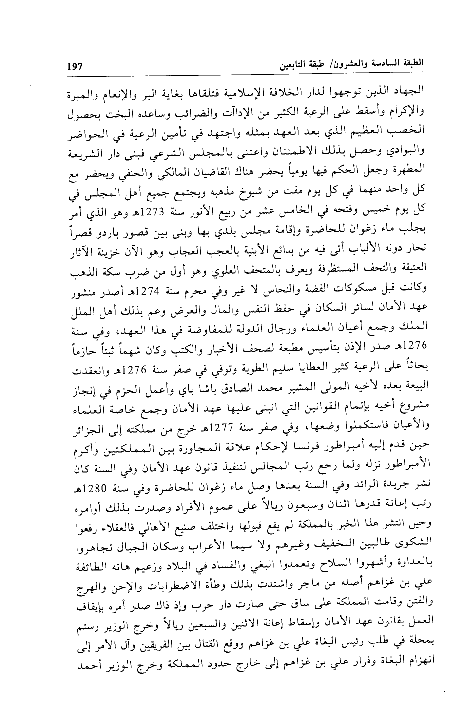 الجهاد الذين توجهوا لدار الخلافة الإِسلامية فتلقاها بغاية البر والإنعام والمبرة والإكرام وأسقط على الرعية الكثير من الإداآت والضرائب وساعده البخت بحصول الخصب العظيم الذي بعد العهد بمثله واجتهد في تأمين الرعية في الحواضر والبوادي وحصل بذلك الاطمئنان واعتنى بالمجلس الشرعي فبنى دار الشريعة المطهرة وجعل الحكم فيها يومياً يحضر هناك القاضيان المالكي والحنفي ويحضر مع كل واحد منهما في كل يوم مفت من شيوخ مذهبه ويجتمع جميع أهل المجلس في كل يوم خميس وفتحه في الخامس عشر من ربيع الأنور سنة 1273هـ وهو الذي أمر بجلب ماء زغوان للحاضرة وإقامة مجلس بلدي بها وبنى بين قصور باردو قصراً تجار دونه الألباب أتى فيه من بدائع الأبنية بالعجب العجاب وهو الآن خزينة الآثار العتيقة والتحف المستظرفة ويعرف بالمتحف العلوي وهو أول من ضرب سكة الذهب وكانت قبل مسكوكات الفضة والنحاس لا غير وفي محرم سنة 1274هـ أصدر منشور عهد الأمان لسائر السكان في حفظ النفس والمال والعرض وعم بذلك أهل الملل الملك وجمع أعيان العلماء ورجال الدولة للمفاوضة في هذا العهد، وفي سنة 1276هـ صدر الإذن بتأسيس مطبعة لصحف الأخبار والكتب وكان شهماً ثبتاً حازماً بحاثاً على الرعية كثير العطايا سليم الطوية وتوفي في صفر سنة 1276هـ وانعقدت البيعة بعده لأخيه المولى المشير محمد الصادق باشا باي وأعمل الحزم في إنجاز مشروع أخيه بإتمام القوانين التي انبنى عليها عهد الأمان وجمع خاصة العلماء والأعيان فاستكملوا وضعها، وفي صفر سنة 1277هـ خرج من مملكته إلى الجزائر حين قدم إليه امبراطور فرنسا لإحكام علاقة المجاورة بين المملكتين وأكرم الأمبراطور نزله ولما رجع رتب المجالس لتنفيذ قانون عهد الأمان وفي السنة كان نشر جريدة الرائد وفي السنة بعدها وصل ماء زغوان للحاضرة وفي سنة 1280هـ رتب إعانة قدرها اثنان وسبعون ريالاً على عموم الأفراد وصدرت بذلك أوامره وحين انتشر هذا الخبر بالمملكة لم يقع قبولها واختلف صنيع الأهالي فالعقلاء رفعوا الشكوى طالبين التخفيف وغيرهم ولا سيما الأعراب وسكان الجبال تجاهروا بالعداوة وأشهروا السلاح وتعمدوا البغي والفساد في البلاد وزعيم هاته الطائفة علي بن غزاهم أصله من ماجر واشتدت بذلك وطأة الاضطرابات والإحن والهرج والفتن وقامت المملكة على ساق حتى صارت دار حرب وإذ ذاك صدر أمره بإيقاف العمل بقانون عهد الأمان وإسقاط إعانة الاثنين والسبعين ريالاً وخرج الوزير رستم بمحلة في طلب رئيس البغاة علي بن غزاهم ووقع القتال بين الفريقين وآل الأمر إلى انهزام البغاة وفرار علي بن غزاهم إلى خارج حدود المملكة وخرج الوزير أحمد