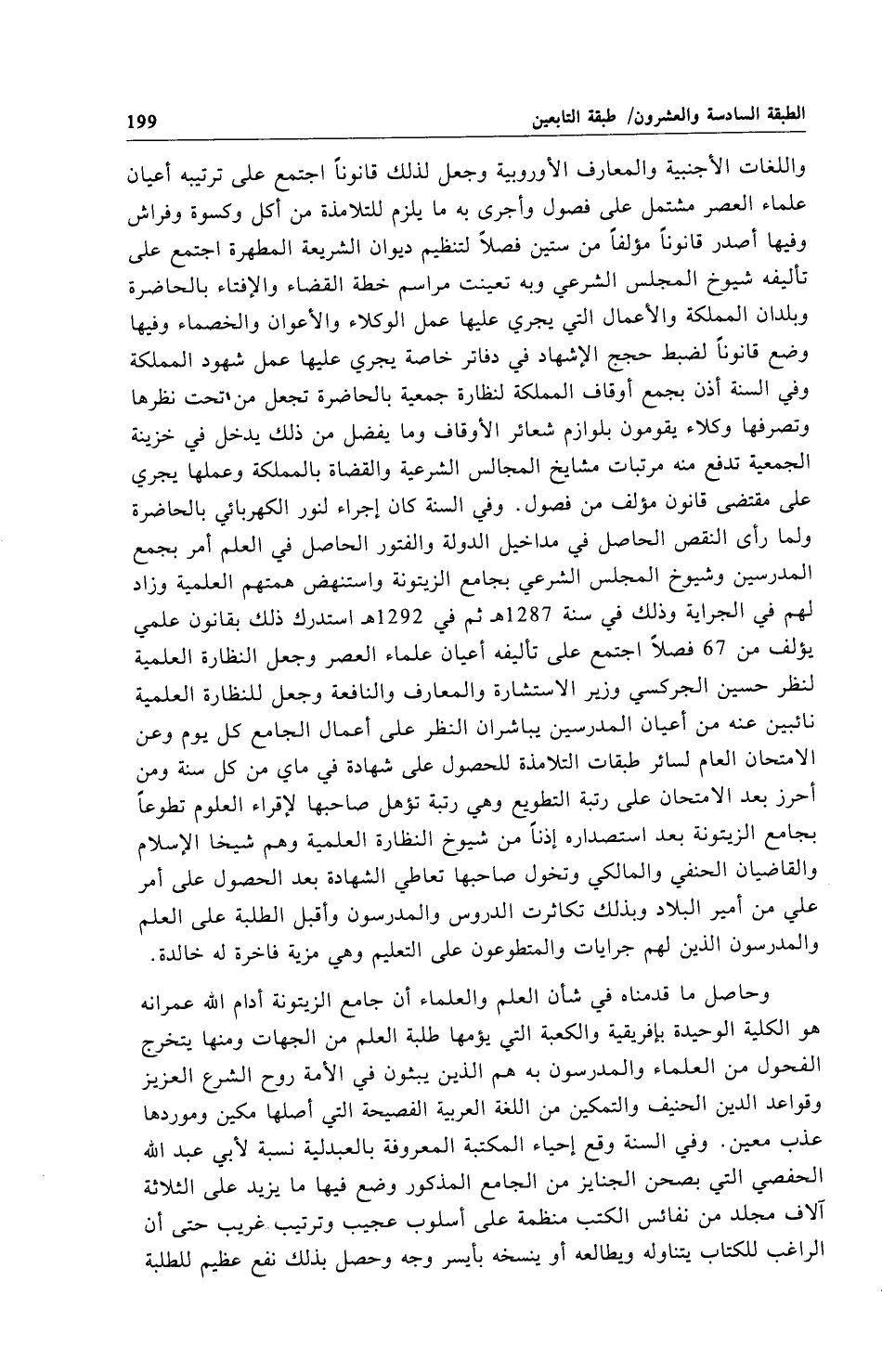 وحاصل ما قدمناه في شأن العلم والعلماء أن جامع الزيتونة أدام الله عمرانه هو الكلية الوحيدة بإفريقية والكعبة التي يؤمها طلبة العلم من الجهات ومنها يتخرج الفحول من العلماء والمدرسون به هم الذين يبثون في الأمة روح الشرع العزيز وقواعد الدين الحنيف والتمكين من اللغة العربية الفصيحة التي أصلها مكين وموردها عذب معين. وفي السنة وقع إحياء المكتبة المعروفة بالعبدلية نسبة لأبي عبد الله الحفصي التي بصحن الجنايز من الجامع المذكور وضع فيها ما يزيد على الثلاثة آلاف مجلد من نفائس الكتب منظمة على أسلوب عجيب وترتيب غريب حتى أن الراغب للكتاب يتناوله ويطالعه أو ينسخه بأيسر وجه وحصل بذلك نفع عظيم للطلبة