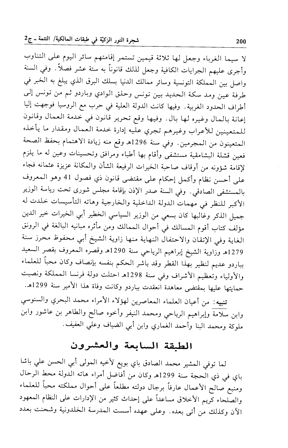 لا سيما الغرباء وجعل لها ثلاثة قيمين تستمر إقامتهم سائر اليوم على التناوب وأجرى عليهم الجرايات الكافية وجعل لذلك قانوناً به ستة عشر فصلاً. وفي السنة واصل بين المملكة التونسية وسائر ممالك الدنيا بسلك البرق الذي يبلغ به الخبر في طرفة عين ومد سكة الحديد بين تونس وحلق الوادي وباردو ثم من تونس إلى أطراف الحدود الغربية. وفيها كانت الدولة العلية في حرب مع الروسيا فوجهت إليا إعانة بالمال وغيره لها بال. وفيها وقع تحرير قانون في خدمة العمال وقانون للمتعينين للأعراب وغيرهم تجري عليه إدارة خدمة العمال ومقدار ما يأخذه المتعينون من المجرمين. وفي سنة 1296هـ وقع منه زيادة الاهتمام بحفظ الصحة فعين قشلة البشامقية مستشفى وأقام بها أطباء ومرافق وتحسينات وعين له ما يلزم لإقامة شؤونه من أوقاف صاحبة الخيرات الرفيعة الشأن والمكانة عزيزة عثمانه فجاء على أحسن نظام وأكمل إحكام على مقتضى قانون ذي فصول 41 وهو المعروف بالمستشفى الصادقي. وفي السنة صدر الإذن بإقامة مجلس شورى تحت رياسة الوزير الأكبر للنظر في مهمات الدولة الداخلية والخارجية وهاته التأسيسات خلدت له جميل الذكر وغالبها كان بسعي من الوزير السياسي الخطير أبي الخيرات خير الدين مؤلف كتاب أقوم المسالك في أحوال الممالك ومن مأثره مبانيه البالغة في الرونق الغاية وفي الإتقان والاحتفال النهاية منها زاوية الشيخ أبي محفوظ محرز سنة 1279هـ وزاوية الشيخ إبراهيم الرياحي سنة 1290هـ وقصره المعروف بقصر السعيد بباردو عدم لنظير بهذا القطر وقد باشر الحكم بنفسه بإنصاف وكان محباً للعلماء والأولياء وتعظيم الأشراف وفي سنة 1298هـ احتلت دولة فرنسا المملكة ونصبت حمايتها عليها بمقتضى معاهدة انعقدت بباردو وكانت وفاة هذا الأمير سنة 1299هـ.