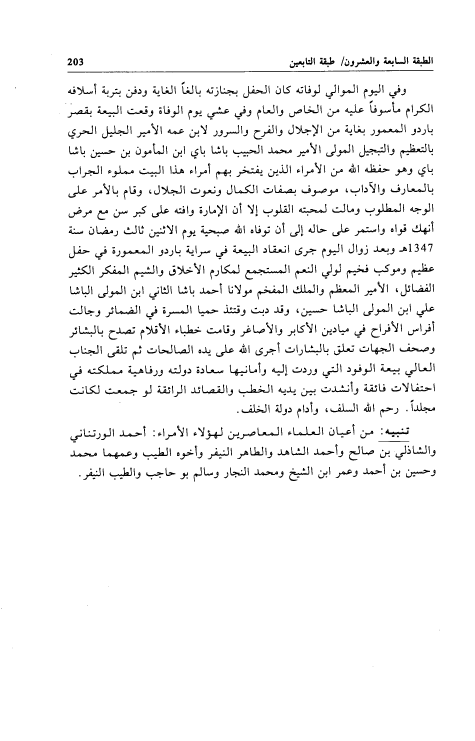 وفي اليوم الموالي لوفاته كان الحفل بجنازته بالغاً الغاية ودفن بتربة أسلافه الكرام مأسوفاً عليه من الخاص والعام وفي عشي يوم الوفاة وقعت البيعة بقصر باردو المعمور بغاية من الإجلال والفرح والسرور لابن عمه الأمير الجليل الحري بالتعظيم والتبجيل المولى الأمير محمد الحبيب باشا باي ابن المأمون بن حسين باشا باي وهو حفظه الله من الأمراء الذين يفتخر بهم أمراء هذا البيت مملوء الجراب بالمعارف والآداب، موصوف بصفات الكمال ونعوت الجلال، وقام بالأمر على الوجه المطلوب ومالت لمحبته القلوب إلا أن الإمارة وافته على كبر سن مع مرض أنهك قواه واستمر على حاله إلى أن توفاه الله صبحية يوم الاثنين ثالث رمضان سنة 1347هـ وبعد زوال اليوم جرى انعقاد البيعة في سراية باردو المعمورة في حفل عظيم وموكب فخيم لولي النعم المستجمع لمكارم الأخلاق والشيم المفكر الكثير الفضائل، الأمير المعظم والملك المفخم مولانا أحمد باشا الثاني ابن المولى الباشا علي ابن المولى الباشا حسين، وقد دبت وقتئذ حميا المسرة في الضمائر وجالت أفراس الأفراح في ميادين الأكابر والأصاغر وقامت خطباء الأقلام تصدح بالبشائر وصحف الجهات تعلق بالبشارات أجرى الله على يده الصالحات ثم تلقى الجناب العالي بيعة الوفود التي وردت إليه وأمانيها سعادة دولته ورفاهية مملكته في احتفالات فائقة وأنشدت بين يديه الخطب والقصائد الرائقة لو جمعت لكانت مجلداً. رحم الله السلف، وأدام دولة الخلف.