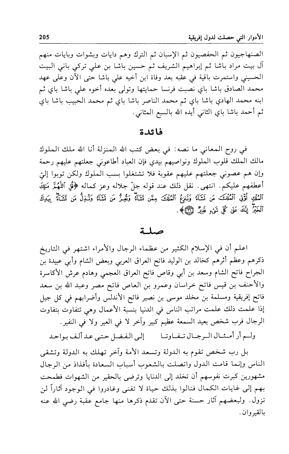 بل رب شخص تقوم به الدولة وتسعد الأمة وآخر تهلك به الدولة وتشقى الناس وإنما قامت الدول واتصلت بالشعوب أسباب السعادة بأفذاذ من الرجال مشهورين كبرت نفوسهم أن تخلد إلى الدنايا وترضى بالحقير من الشهوات فطمحت بهم إلى غايات الكمال فنالوا بذلك حياة لا تفنى وغادروا في الوجود آثاراً لن تزول. ولبعضهم آثار حسنة حتى الآن تقدم ذكرها منها جامع عقبة رضي الله عنه بالقيروان.