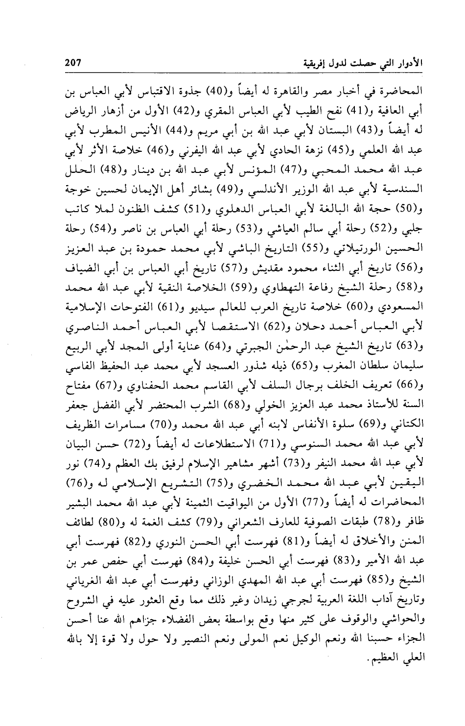 المحاضرة في أخبار مصر والقاهرة له أيضاً و (40) جذوة الاقتباس لأبي العباس بن أبي العافية و (41) نفح الطيب لأبي العباس المقري و (42) الأول من أزهار الرياض له أيضاً و (43) البستان لأبي عبد الله بن أبي مريم و (44) الأنيس المطرب لأبي عبد الله العلمي و (45) نزهة الحادي لأبي عبد الله اليفرني و (46) خلاصة الأثر لأبي عبد الله محمد المحبي و (47) المؤنس لأبي عبد الله بن دينار و (48) الحلل السندسية لأبي عبد الله الوزير الأندلسي و (49) بشائر أهل الإيمان لحسين خوجة و (50) حجة الله البالغة لأبي العباس الدهلوي و (51) كشف الظنون لملا كاتب جلبي و (52) رحلة أبي سالم العياشي و (53) رحلة أبي العباس بن ناصر و (54) رحلة الحسين الورتيلاتي و (55) التاريخ الباشي لأبي محمد حمودة بن عبد العزيز و (56) تاريخ أبي الثناء محمود مقديش و (57) تاريخ أبي العباس بن أبي الضياف و (58) رحلة الشيخ رفاعة التهطاوي و (59) الخلاصة النقية لأبي عبد الله محمد المسعودي و (60) خلاصة تاريخ العرب للعالم سيديو و (61) الفتوحات الإِسلامية لأبي العباس أحمد دحلان و (62) الاستقصا لأبي العباس أحمد الناصري و (63) تاريخ الشيخ عبد الرحمن الجبرتي و (64) عناية أولى المجد لأبي الربيع سليمان سلطان المغرب و (65) ذيله شذور العسجد لأبي محمد عبد الحفيظ الفاسي و (66) تعريف الخلف برجال السلف لأبي القاسم محمد الحفناوي و (67) مفتاح السنة للأستاذ محمد عبد العزيز الخولي و (68) الشرب المحتضر لأبي الفضل جعفر الكتاني و (69) سلوة الأنفاس لابنه أبي عبد الله محمد و (70) مسامرات الظريف لأبي عبد الله محمد السنوسي و (71) الاستطلاعات له أيضاً و (72) حسن البيان لأبي عبد الله محمد النيفر و (73) أشهر مشاهير الإسلام لرفيق بك العظم و (74) نور اليقين لأبي عبد الله محمد الخضري و (75) التشريع الإسلامي له و (76) المحاضرات له أيضاً و (77) الأول من اليواقيت الثمينة لأبي عبد الله محمد البشير ظافر و (78) طبقات الصوفية للعارف الشعراني و (79) كشف الغمة له و (80) لطائف المنن والأخلاق له أيضاً و (81) فهرست أبي الحسن النوري و (82) فهرست أبي عبد الله الأمير و (83) فهرست أبي الحسن خليفة و (84) فهرست أبي حفص عمر بن الشيخ و (85) فهرست أبي عبد الله المهدي الوزاني وفهرست أبي عبد الله الغرياني وتاريخ آداب اللغة العربية لجرجي زيدان وغير ذلك مما وقع العثور عليه في الشروح والحواشي والوقوف على كثير منها وقع بواسطة بعض الفضلاء جزاهم الله عنا أحسن الجزاء حسبنا الله ونعم الوكيل نعم المولى ونعم النصير ولا حول ولا قوة إلا بالله العلي العظيم.