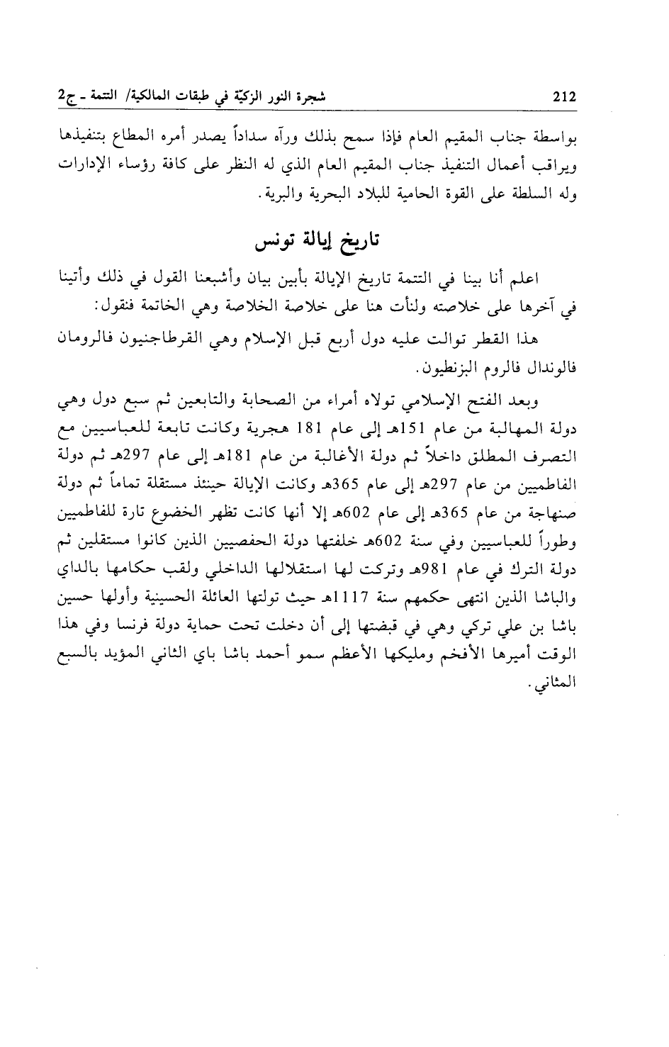 وبعد الفتح الإِسلامي تولاه أمراء من الصحابة والتابعين ثم سبع دول وهي دولة المهالبة من عام 151هـ إلى عام 181 هجرية وكانت تابعة للعباسيين مع التصرف المطلق داخلاً ثم دولة الأغالبة من عام 181هـ إلى عام 297 هـ ثم دولة الفاطميين من عام 297هـ إلى عام 365 هـ وكانت الإيالة حينئذ مستقلة تماماً ثم دولة صنهاجة من عام 365 هـ إلى عام 602هـ إلا أنها كانت تظهر الخضوع تارة للفاطميين وطوراً للعباسيين وفي سنة 602 هـ خلفتها دولة الحفصيين الذين كانوا مستقلين ثم دولة الترك في عام 981 هـ وتركت لها استقلالها الداخلي ولقب حكامها بالداي والباشا الذين انتهى حكمهم سنة 1117هـ حيث تولتها العائلة الحسينية وأولها حسين باشا بن علي تركي وهي في قبضتها إلى أن دخلت تحت حماية دولة فرنسا وفي هذا الوقت أميرها الأفخم ومليكها الأعظم سمو أحمد باشا باي الثاني المؤيد بالسبع المثاني.