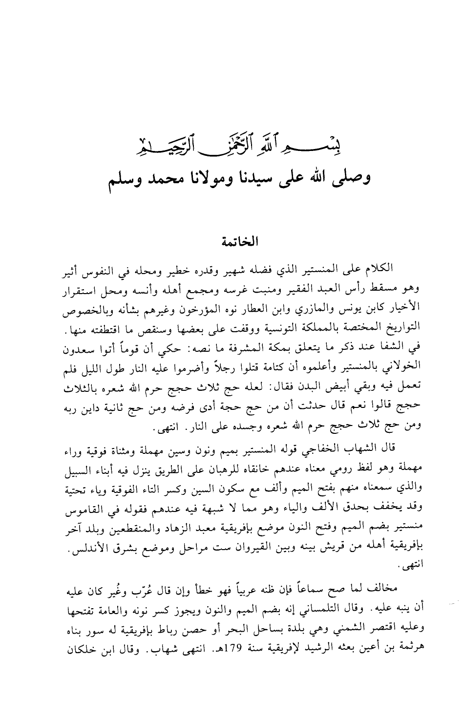 الكلام على المنستير الذي فضله شهير وقدره خطير ومحله في النفوس أثير وهو مسقط رأس العبد الفقير ومنبت غرسه ومجمع أهله وأنسه ومحل استقرار الأخيار كابن يونس والمازري وابن العطار نوه المؤرخون وغيرهم بشأنه وبالخصوص التواريخ المختصة بالمملكة التونسية ووقفت على بعضها وسنقص ما اقتطفته منها. في الشفا عند ذكر ما يتعلق بمكة المشرفة ما نصه: حكي أن قوماً أتوا سعدون الخولاني بالمنستير وأعلموه أن كتامة قتلوا رجلاً وأضرموا عليه النار طول الليل فلم تعمل فيه وبقي أبيض البدن فقال: لعله حج ثلاث حج حرم الله شعره بالثلاث حجج قالوا نعم قال حدثت أن من حج حجة أدى فرضه ومن حج ثانية داين ربه ومن حج ثلاث حجج حرم الله شعره وجسده على النار. انتهى.