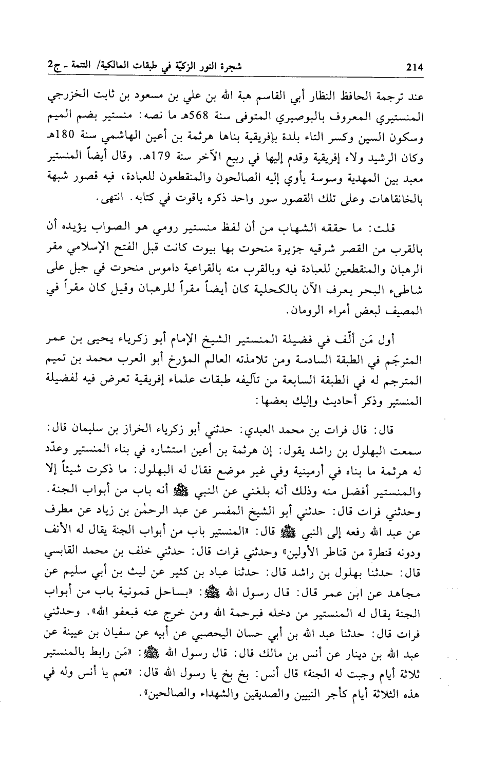 قال: قال فرات بن محمد العبدي: حدثني أبو زكرياء الخراز بن سليمان قال: سمعت البهلول بن راشد يقول: إن هرثمة بن أعين استشاره في بناء المنستير وعدّد له هرثمة ما بناه في أرمينية وفي غير موضع فقال له البهلول: ما ذكرت شيئاً إلا والمنستير أفضل منه وذلك أنه بلغني عن النبي - صلى الله عليه وسلم - أنه باب من أبواب الجنة. وحدثني فرات قال: حدثني أبو الشيخ المفسر عن عبد الرحمن بن زياد عن مطرف عن عبد الله رفعه إلى النبي - صلى الله عليه وسلم - قال: "المنستير باب من أبواب الجنة يقال له الأنف ودونه قنطرة من قناطر الأولين" وحدثني فرات قال: حدثني خلف بن محمد القابسي قال: حدثنا بهلول بن راشد قال: حدثنا عباد بن كثير عن ليث بن أبي سليم عن مجاهد عن ابن عمر قال: قال رسول الله - صلى الله عليه وسلم -: "بساحل قمونية باب من أبواب الجنة يقال له المنستير من دخله فبرحمة الله ومن خرج عنه فبعفو الله". وحدثني فرات قال: حدثنا عبد الله بن أبي حسان اليحصبي عن أبيه عن سفيان بن عيينة عن عبد الله بن دينار عن أنس بن مالك قال: قال رسول الله - صلى الله عليه وسلم -: "مَن رابط بالمنستير ثلاثة أيام وجبت له الجنة" قال أنس: بخ بخ يا رسول الله قال: "نعم يا أنس وله في هذه الثلاثة أيام كأجر النبيين والصديقين والشهداء والصالحين".