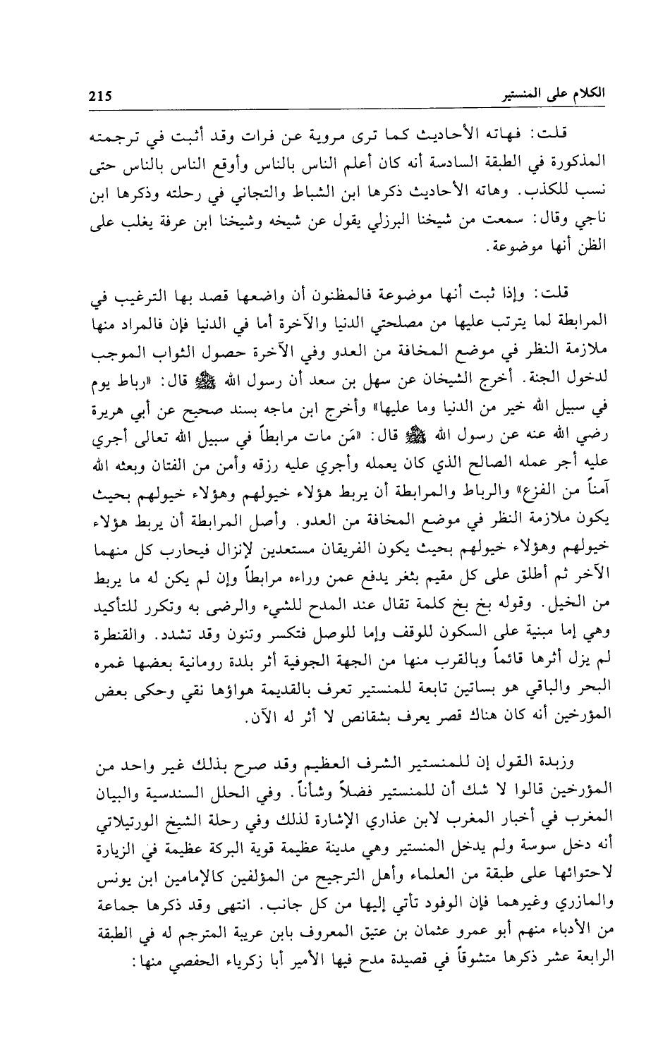 قلت: وإذا ثبت أنها موضوعة فالمظنون أن واضعها قصد بها الترغيب في المرابطة لما يترتب عليها من مصلحتي الدنيا والآخرة أما في الدنيا فإن فالمراد منها ملازمة النظر في موضع المخافة من العدو وفي الآخرة حصول الثواب الموجب لدخول الجنة. أخرج الشيخان عن سهل بن سعد أن رسول الله - صلى الله عليه وسلم - قال: "رباط يوم في سبيل الله خير من الدنيا وما عليها" وأخرج ابن ماجه بسند صحيح عن أبي هريرة رضي الله عنه عن رسول الله - صلى الله عليه وسلم - قال: "مَن مات مرابطاً في سبيل الله تعالى أجري عليه أجر عمله الصالح الذي كان يعمله وأجري عليه رزقه وأمن من الفتان وبعثه الله آمناً من الفزع" والرباط والمرابطة أن يربط هؤلاء خيولهم وهؤلاء خيولهم بحيث يكون ملازمة النظر في موضع المخافة من العدو. وأصل المرابطة أن يربط هؤلاء خيولهم وهؤلاء خيولهم بحيث يكون الفريقان مستعدين لإنزال فيحارب كل منهما الآخر ثم أطلق على كل مقيم بثغر يدفع عمن وراءه مرابطاً وإن لم يكن له ما يربط من الخيل. وقوله بخ بخ كلمة تقال عند المدح للشيء والرضى به وتكرر للتأكيد وهي إما مبنية على السكون للوقف وإما للوصل فتكسر وتنون وقد تشدد. والقنطرة لم يزل أثرها قائماً وبالقرب منها من الجهة الجوفية أثر بلدة رومانية بعضها غمره البحر والباقي هو بساتين متابعة للمنستير تعرف بالقديمة هواؤها نقي وحكى بعض المؤرخين أنه كان هناك قصر يعرف بشقانص لا أثر له الآن.