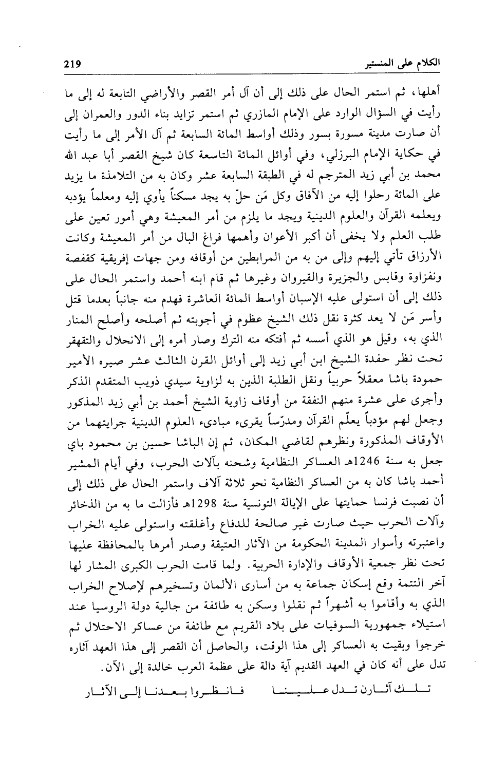 أهلها، ثم استمر الحال على ذلك إلى أن آل أمر القصر والأراضي التابعة له إلى ما رأيت في السؤال الوارد على الإمام المازري ثم استمر تزايد بناء الدور والعمران إلى أن صارت مدينة مسورة بسور وذلك أواسط المائة السابعة ثم آل الأمر إلى ما رأيت في حكايته الإمام البرزلي، وفي أوائل المائة التاسعة كان شيخ القصر أبا عبد الله محمد بن أبي زيد المترجم له في الطبقة السابعة عشر وكان به من التلامذة ما يزيد على المائة رحلوا إليه من الآفاق وكل مَن حلّ به يجد مسكناً يأوي إليه ومعلماً يؤدبه ويعلمه القرآن والعلوم الدينية ويجد ما يلزم من أمر المعيشة وهي أمور تعين على طلب العلم ولا يخفى أن أكبر الأعوان وأهمها فراغ البال من أمر المعيشة وكانت الاْرزاق تأتي إليهم وإلى من به من المرابطين من أوقافه ومن جهات إفريقية كقفصة ونفزاوة وقابس والجزيرة والقيروان وغيرها ثم قام ابنه أحمد واستمر الحال على ذلك إلى أن استولى عليه الإسبان أواسط المائة العاشرة فهدم منه جانباً بعد ما قتل وأسر مَن لا يعد كثرة نقل ذلك الشيخ عظوم في أجوبته ثم أصلحه وأصلح المنار الذي به، وقيل هو الذي أسسه ثم أفتكه منه الترك وصار أمره إلى الانحلال والتقهقر تحت نظر حفدة الشيخ ابن أبي زيد إلى أوائل القرن الثالث عشر صيره الأمير حمودة باشا معقلاً حربياً ونقل الطلبة الذين به لزاوية سيدي ذويب المتقدم الذكر وأجرى على عشرة منهم النفقة من أوقاف زاوية الشيخ أحمد بن أبي زيد المذكور وجعل لهم مؤدباً يعلّم القرآن ومدرّساً يقرىء مبادئ العلوم الدينية جرايتهما من الأوقاف المذكورة ونظرهم لقاضي المكان، ثم إن الباشا حسين بن محمود باي جعل به سنة 1246هـ العساكر النظامية وشحنه بآلات الحرب، وفي أيام المشير أحمد باشا كان به من العساكر النظامية نحو ثلاثة آلاف واستمر الحال على ذلك إلى أن نصبت فرنسا حمايتها على الإيالة التونسية سنة 1298هـ فأزالت ما به من الذخائر وآلات الحرب حيث صارت غير صالحة للدفاع وأغلقته واستولى عليه الخراب واعتبرته وأسوار المدينة الحكومة من الآثار العتيقة وصدر أمرها بالمحافظة عليها تحت نظر جمعية الأوقاف والإدارة الحربية. ولما قامت الحرب الكبرى المشار لها آخر التتمة وقع إسكان جماعة به من أسارى الألمان وتسخيرهم لإصلاح الخراب الذي به وأقاموا به أشهراً ثم نقلوا وسكن به طائفة من جالية دولة الروسيا عند استيلاء جمهورية السوفيات على بلاد القريم مع طائفة من عساكر الاحتلال ثم خرجوا وبقيت به العساكر إلى هذا الوقت، والحاصل أن القصر إلى هذا العهد آثاره تدل على أنه كان في العهد القديم آية دالة على عظمة العرب خالدة إلى الآن.