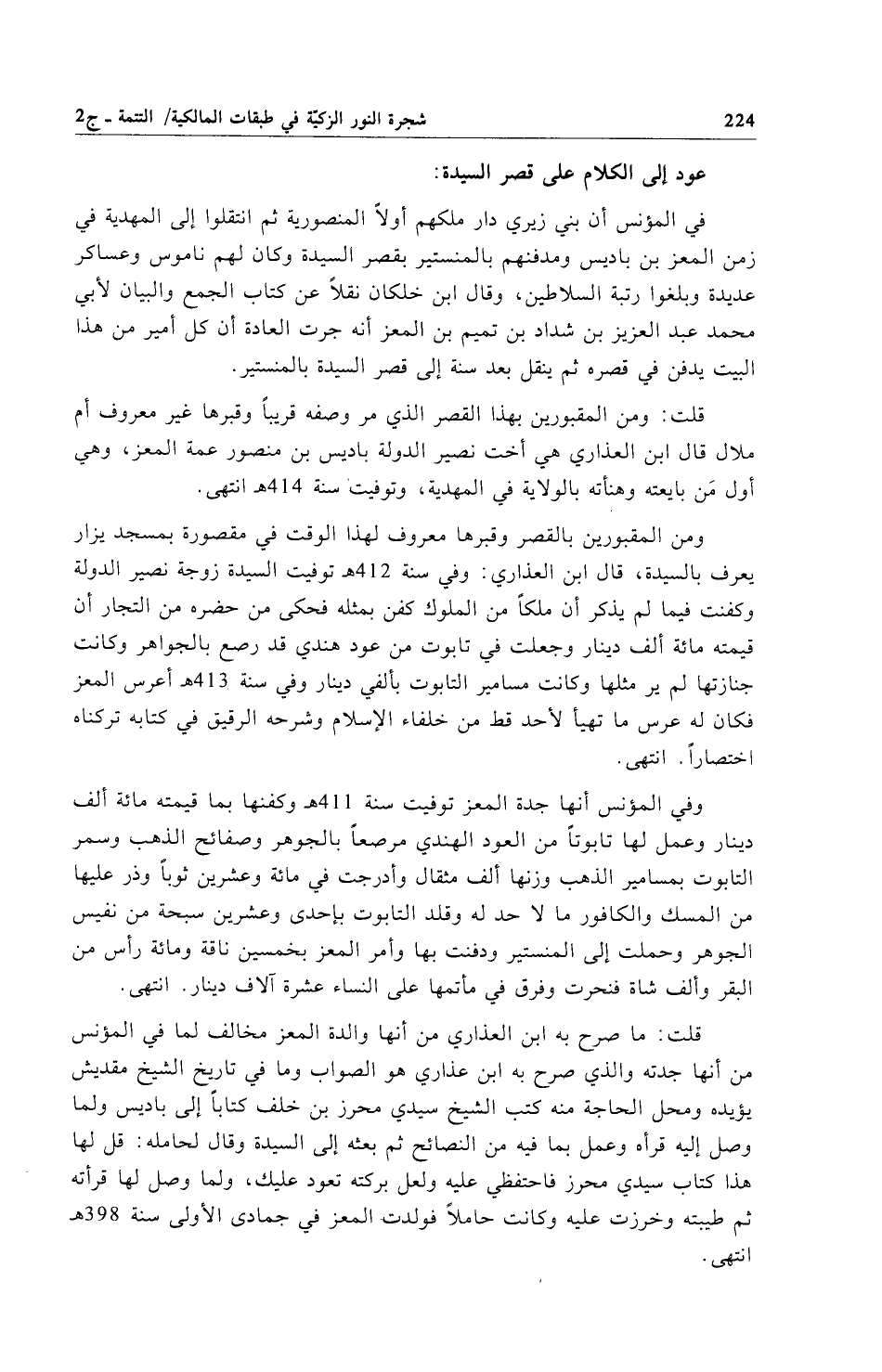 قلت. ما صرح به ابن العذاري من أنها والدة المعز مخالف لما في المؤنس من أنها جدته والذي صرح به ابن عذاري هو الصواب وما في تاريخ الشيخ مقديش يؤيده ومحل الحاجة منه كتب الشيخ سيدي محرز بن خلف كتاباً إلى باديس ولما وصل إليه قرأه وعمل بما فيه من النصائح ثم بعثه إلى السيدة وقال لحامله: قل لها هذا كتاب سيدي محرز فاحتفظي عليه ولعل بركته تعود عليك، ولما وصل لها قرأته ثم طيبته وخرزت عليه وكانت حاملاً فولدت المعز في جمادى الأولى سنة 398 هـ انتهى.