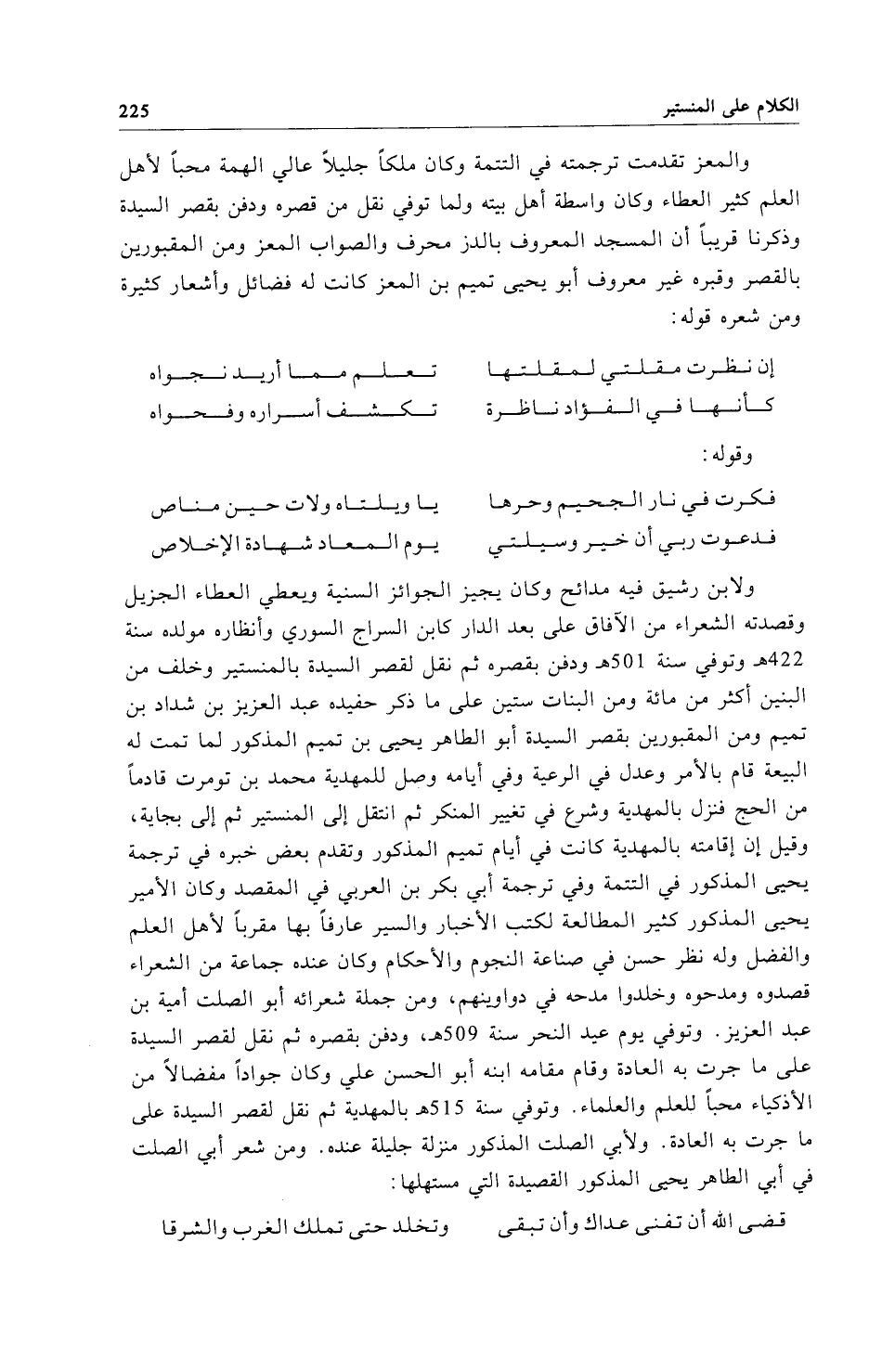 ولابن رشيق فيه مدائح وكان يجيز الجوائز السنية ولعطي العطاء الجزيل وقصدته الشعراء من الآفاق على بعد الدار كابن السراج السوري وأنظاره مولده سنة 422 هـ وتوفي سنه 501 هـ ودفن بقصره ثم نقل لقصر السيدة بالمنستير وخلف من البنين أكثر من مائة ومن البنات ستين على ما ذكر حفيده عبد العزيز بن شداد بن تميم ومن المقبورين بقصر السيدة أبو الطاهر يحيي بن تميم المذكور لما تمت له البيعة قام بالأمر وعدل في الرعية وفي أيامه وصل للمهدية محمد بن تومرت قادماً من الحج فنزل بالمهدية وشرع في تغيير المنكر ثم انتقل إلى المنستير ثم إلى بجاية، وقيل إن إقامته بالمهدية كانت في أيام تميم المذكور وتقدم بعض خبره في ترجمة يحيى المذكور في التتمة وفي ترجمة أبي بكر بن العربي في المقصد وكان الأمير يحيى المذكور كثير المطالعة لكتب الأخبار والسير عارفاً بها مقرباً لأهل العلم والفضل وله نظر حسن في صناعة النجوم والأحكام وكان عنده جماعة من الشعراء قصدوه ومدحوه وخلدوا مدحه في دواوينهم، ومن جملة شعرائه أبو الصلت أمية بن عبد العزيز. وتوفي يوم عيد النحر سنة 509 هـ، ودفن بقصره ثم نقل لقصر السيدة على ما جرت به العادة وقام مقامه ابنه أبو الحسن علي وكان جواداً مفضالاً من الأذكياء محباً للعلم والعلماء. وتوفي سنة 515 هـ بالمهدية ثم نقل لقصر السيدة على ما جرت به العادة. ولأبي الصلت المذكور منزلة جليلة عنده. ومن شعر أبي الصلت في أبي الطاهر يحيى المذكور القصيدة التي مستهلها: