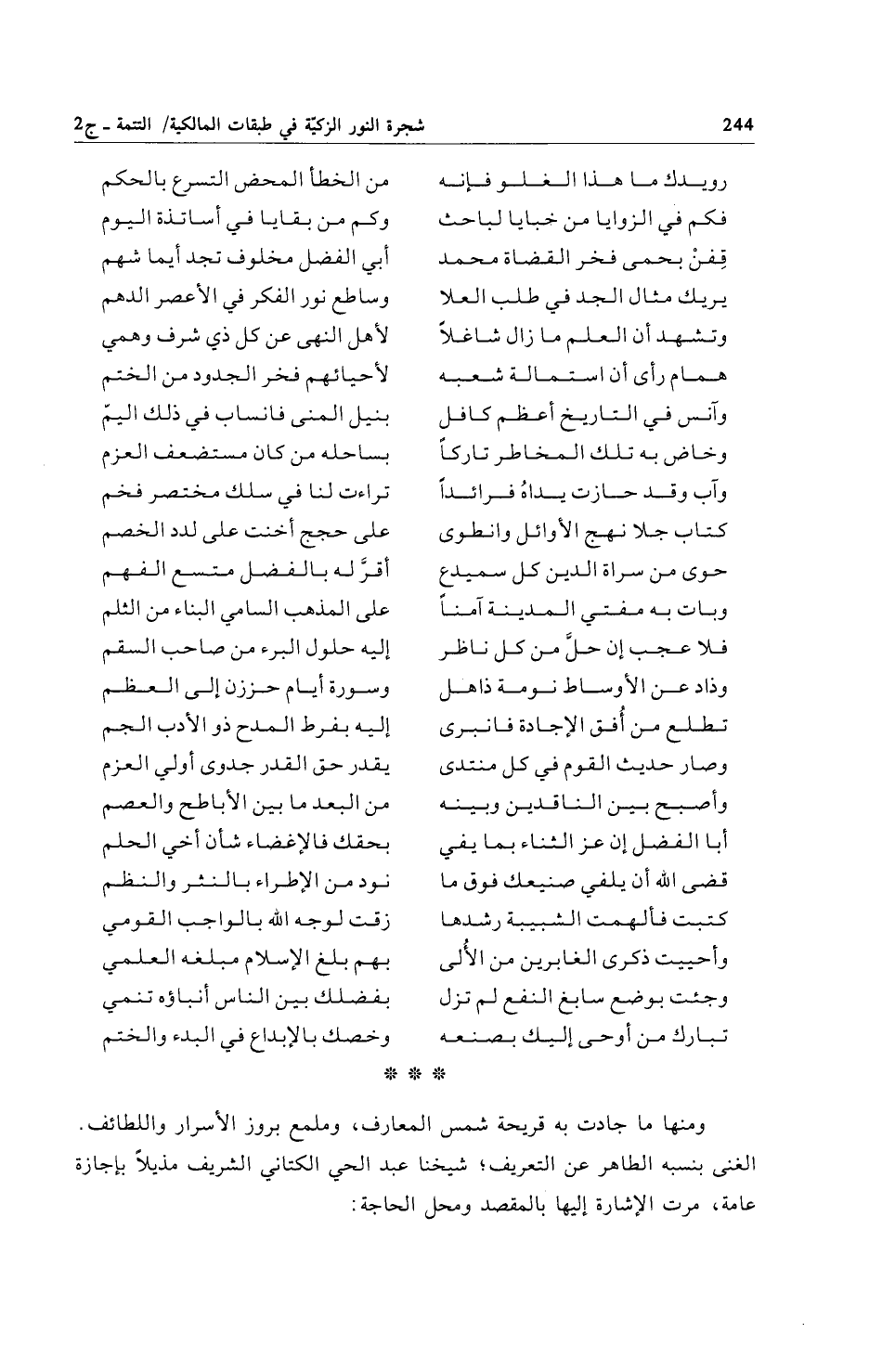 ومنها ما جادت به قريحة شمس المعارف، وملمع بروز الأسرار واللطائف. الغنى بنسبه الطاهر عن التعريف؛ شيخنا عبد الحي الكتاني الشريف مذيلاً بإجازة عامة، مرت الإشارة إليها بالمقصد ومحل الحاجة: