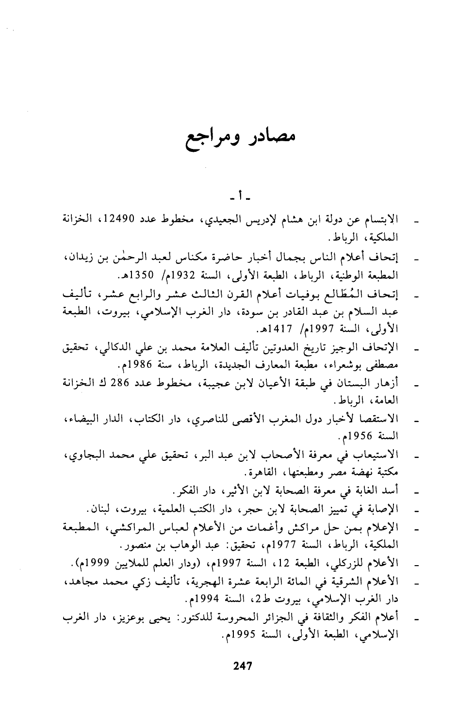 - إتحاف أعلام الناس بجمال أخبار حاضرة مكناس لعبد الرحمن بن زيدان، المطبعة الوطنية، الرباط، الطبعة الأولى، السنة 1932م/ 1350 هـ.
