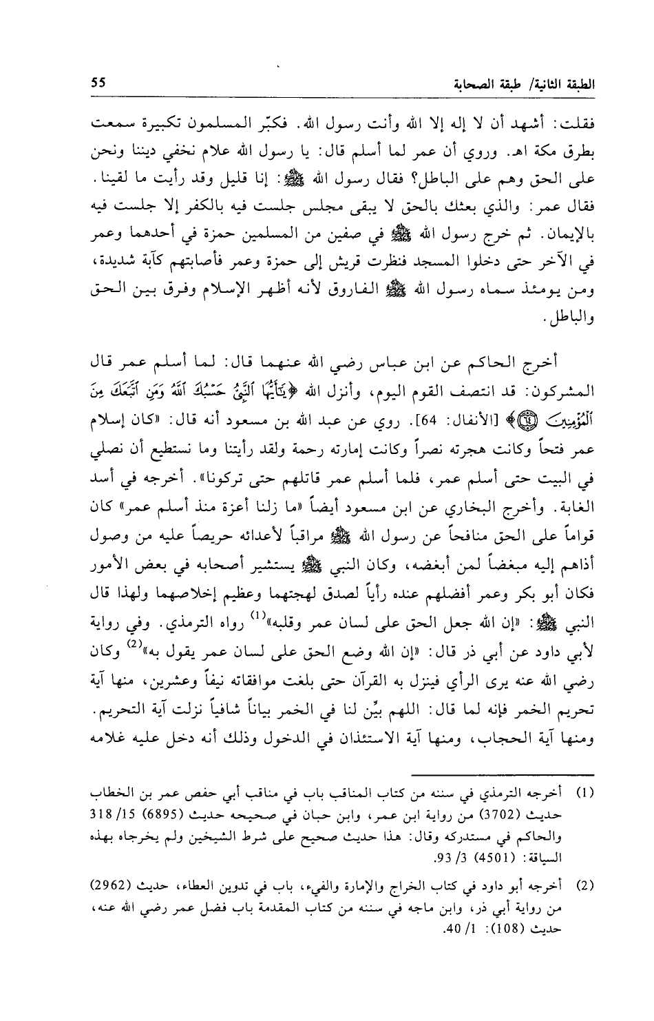 فقلت: أشهد أن لا إله إلا الله وأنت رسول الله. فكبّر المسلمون تكبيرة سمعت بطرق مكة اهـ. وروي أن عمر لما أسلم قال: يا رسول الله علام نخفي ديننا ونحن على الحق وهم على الباطل؟ فقال رسول الله - صلى الله عليه وسلم -: إنا قليل وقد رأيت ما لقينا. فقال عمر: والذي بعثك بالحق لا يبقى مجلس جلست فيه بالكفر إلا جلست فيه بالإيمان. ثم خرج رسول الله - صلى الله عليه وسلم - في صفين من المسلمين حمزة في أحدهما وعمر في الآخر حتى دخلوا المسجد فنظرت قريب إلى حمزة وعمر فأصابتهم كآبة شديدة، ومن يومئذ سماه رسول الله - صلى الله عليه وسلم - الفاروق لأنه أظهر الإِسلام وفرق بين الحق والباطل.