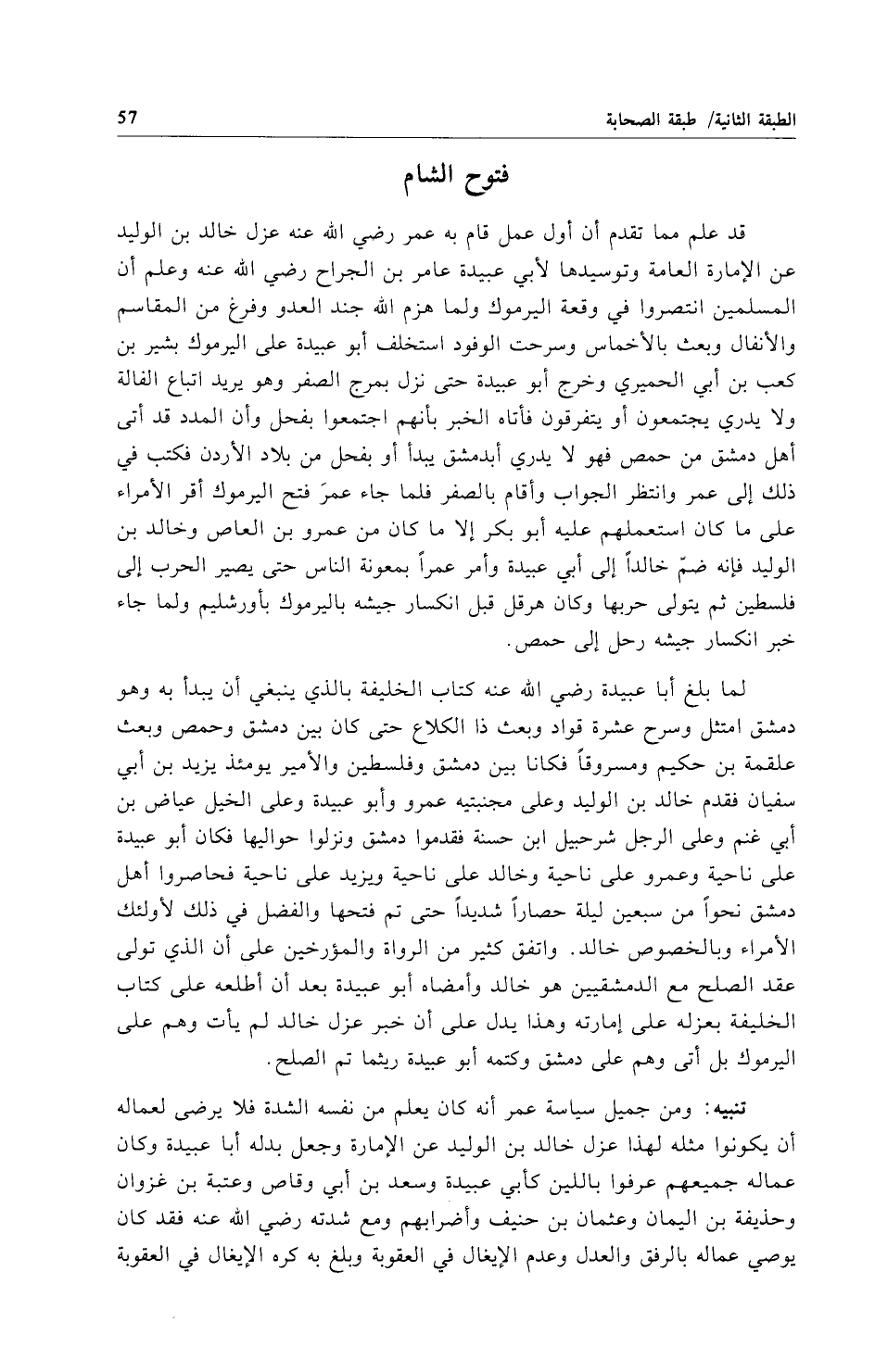 قد علم مما تقدم أن أول عمل قام به عمر رضي الله عنه عزل خالد بن الوليد عن الإمارة العامة وتوسيدها لأبي عبيدة عامر بن الجراح رضي الله عنه وعلم أن المسلمين انتصروا في وقعة اليرموك ولما هزم الله جند العدو وفرغ من المقاسم والأنفال وبعث بالأخماس وسرحت الوفود استخلف أبو عبيدة على اليرموك بشير بن كعب بن أبي الحميري وخرج أبو عبيدة حتى نزل بمرج الصفر وهو يريد اتباع الفالة ولا يدري يجتمعون أو يتفرقون فأتاه الخبر بأنهم اجتمعوا بفحل وأن المدد قد أتى أهل دمشق من حمص فهو لا يدري أبدمشق يبدأ أو بفحل من بلاد الأردن فكتب في ذلك إلى عمر وانتظر الجواب وأقام بالصفر فلما جاء عمرَ فتح اليرموك أقر الأمراء على ما كان استعملهم عليه أبو بكر إلا ما كان من عمرو بن العاص وخالد بن الوليد فإنه ضمّ خالداً إلى أبي عبيدة وأمر عمراً بمعونة الناس حتى يصير الحرب إلى فلسطين ثم يتولى حربها وكان هرقل قبل انكسار جيشه باليرموك بأورشليم ولما جاء خبر انكسار جيشه رحل إلى حمص.