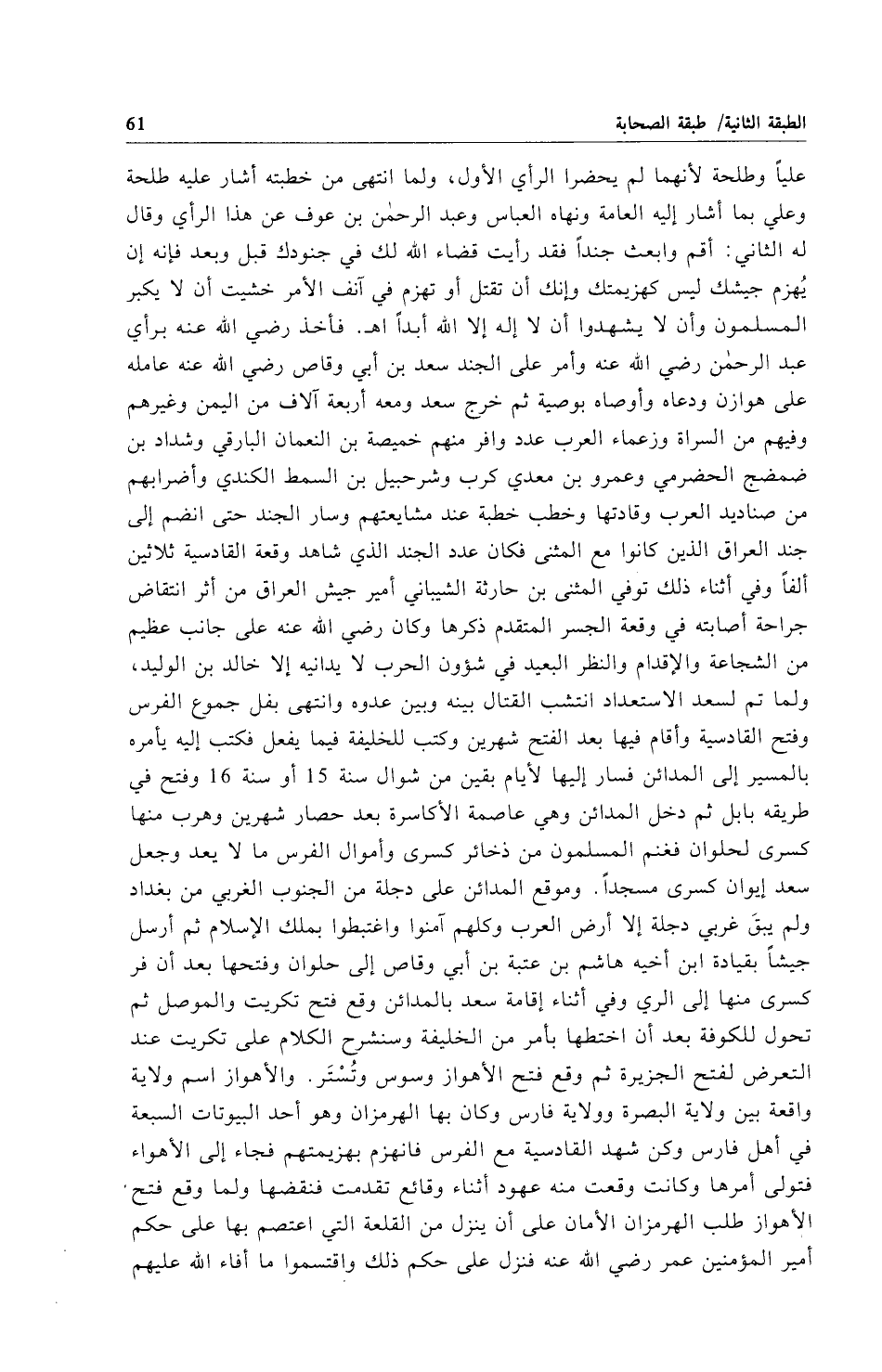 علياً وطلحة لأنهما لم يحضرا الرأي الأول، ولما انتهى من خطبته أشار عليه طلحة وعلي بما أشار إليه العامة ونهاه العباس وعبد الرحمن بن عوف عن هذا الرأي وقال له الثاني: أقم وابعث جنداً فقد رأيت قضاء الله لك في جنودك قبل وبعد فإنه إن يُهزم جيشك ليس كهزيمتك وإنك أن تقتل أو تهزم في آنف الأمر خشيت أن لا يكبر المسلمون وأن لا يشهدوا أن لا إله إلا الله أبداً اهـ. فأخذ رضي الله عنه برأي عبد الرحمن رضي الله عنه وأمر على الجند سعد بن أبي وقاص رضي الله عنه عامله على هوازن ودعاه وأوصاه بوصية ثم خرج سعد ومعه أربعة آلاف من اليمن وغيرهم وفيهم من السراة وزعماء العرب عدد وافر منهم خميصة بن النعمان البارقي وشداد بن ضمضج الحضرمي وعمرو بن معدي كرب وشرحبيل بن السمط الكندي وأضرابهم من صناديد العرب وقادتها وخطب خطبة عند مشايعتهم وسار الجند حتى انضم إلى جند العراق الذين كانوا مع المثنى فكان عدد الجند الذي شاهد وقعة القادسية ثلاثين ألفاً وفي أثناء ذلك توفي المثنى بن حارثة الشيباني أمير جيش العراق من أثر انتقاض جراحة أصابته في وقعة الجسر المتقدم ذكرها وكان رضي الله عنه على جانب عظيم من الشجاعة والإقدام والنظر البعيد في شؤون الحرب لا يدانيه إلا خالد بن الوليد، ولما تم لسعد الاستعداد انتشب القتال بينه وبين عدوه وانتهى بفل جموع الفرس وفتح القادسية وأقام فيها بعد الفتح شهرين وكتب للخليفة فيما يفعل فكتب إليه يأمره بالمسير إلى المدائن فسار إليها لأيام بقين من شوال سنة 15 أو سنة 16 وفتح في طريقه بابل ثم دخل المدائن وهي عاصمة الأكاسرة بعد حصار شهرين وهرب منها كسرى لحلوان فغنم المسلمون من ذخائر كسرى وأموال الفرس ما لا يعد وجعل سعد إيوان كسرى مسجداً. وموقع المدائن على دجلة من الجنوب الغربي من بغداد ولم يبقَ غربي دجلة إلا أرض العرب وكلهم آمنوا واغتبطوا بملك الإِسلام ثم أرسل جيشاً بقيادة ابن أخيه هاشم بن عتبة بن أبي وقاص إلى حلوان وفتحها بعد أن فر كسرى منها إلى الري وفي أثناء إقامة سعد بالمدائن وقع فتح تكريت والموصل ثم تحول للكوفة بعد أن اختطها بأمر من الخليفة وسنشرح الكلام على تكريت عند التعرض لفتح الجزيرة ثم وقع فتح الأهواز وسوس وتُسْتَر. والأهواز اسم ولاية واقعة بين ولاية البصرة وولاية فارس وكان بها الهرمزان وهو أحد البيوتات السبعة في أهل فارس وكن شهد القادسية مع الفرس فانهزم بهزيمتهم فجاء إلى الأهواء فتولى أمرها وكانت وقعت منه عهود أثناء وقائع تقدمت فنقضها ولما وقع فتح الأهواز طلب الهرمزان الأمان على أن ينزل من القلعة التي اعتصم بها على حكم أمير المؤمنين عمر رضي الله عنه فنزل على حكم ذلك واقتسموا ما أفاء الله عليهم
