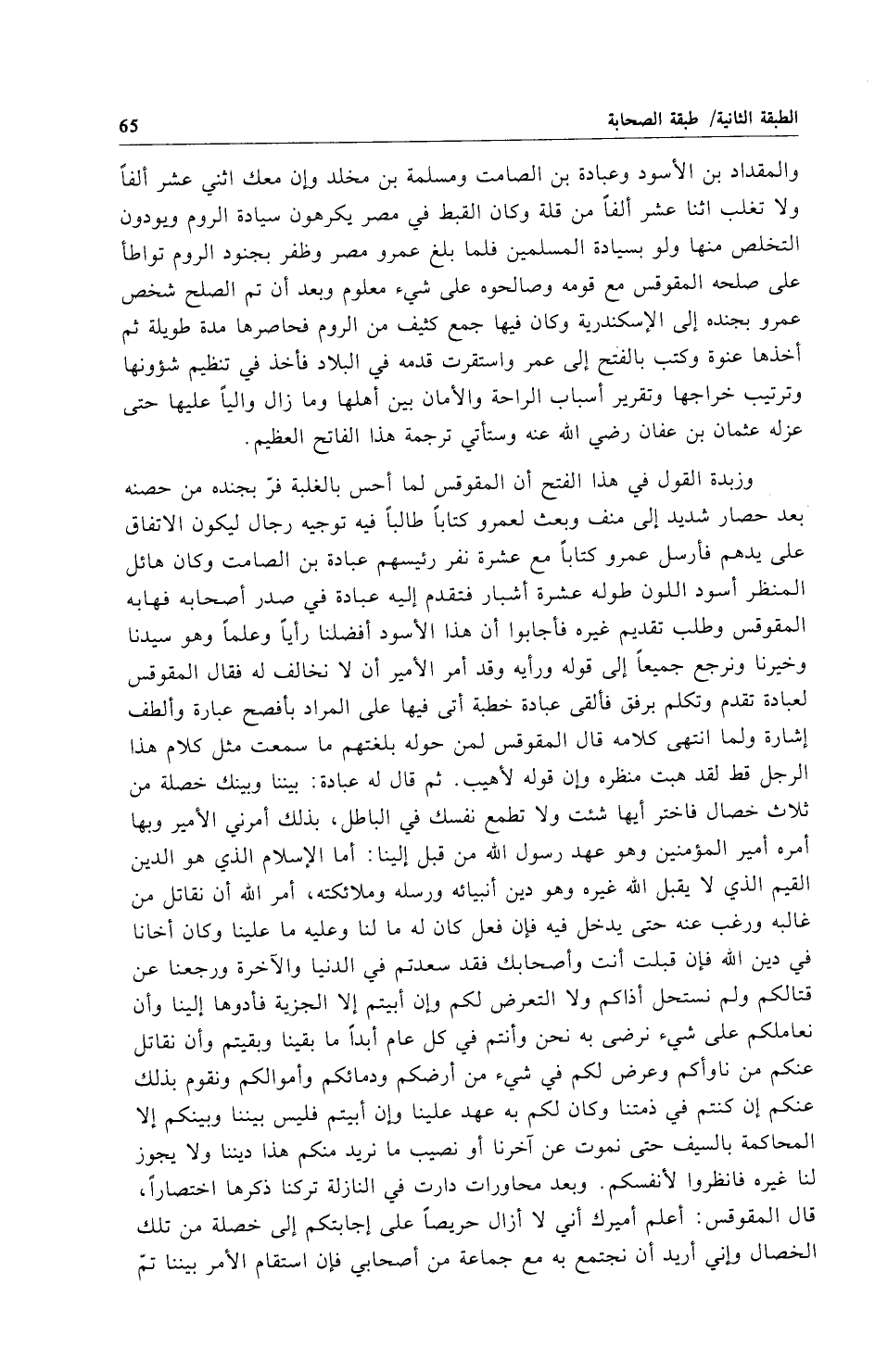 والمقداد بن الأسود وعبادة بن الصامت ومسلمة بن مخلد وإن معك اثني عشر ألفًا ولا تغلب اثنا عشر ألفًا من قلة وكان القبط في مصر يكرهون سيادة الروم ويودون التخلص منها ولو بسيادة المسلمين فلما بلغ عمرو مصر وظفر بجنود الروم تواطأ على صلحه المقوقس مع قومه وصالحوه على شيء معلوم وبعد أن تم الصلح شخص عمرو بجنده إلى الإسكندرية وكان فيها جمع كثيف من الروم فحاصرها مدة طويلة ثم أخذها عنوة وكتب بالفتح إلى عمر واستقرت قدمه في البلاد فأخذ في تنظيم شؤونها وترتيب خراجها وتقرير أسباب الراحة والأمان بين أهلها وما زال والياً عليها حتى عزله عثمان بن عفان رضي الله عنه وستأتي ترجمة هذا الفاتح العظيم.