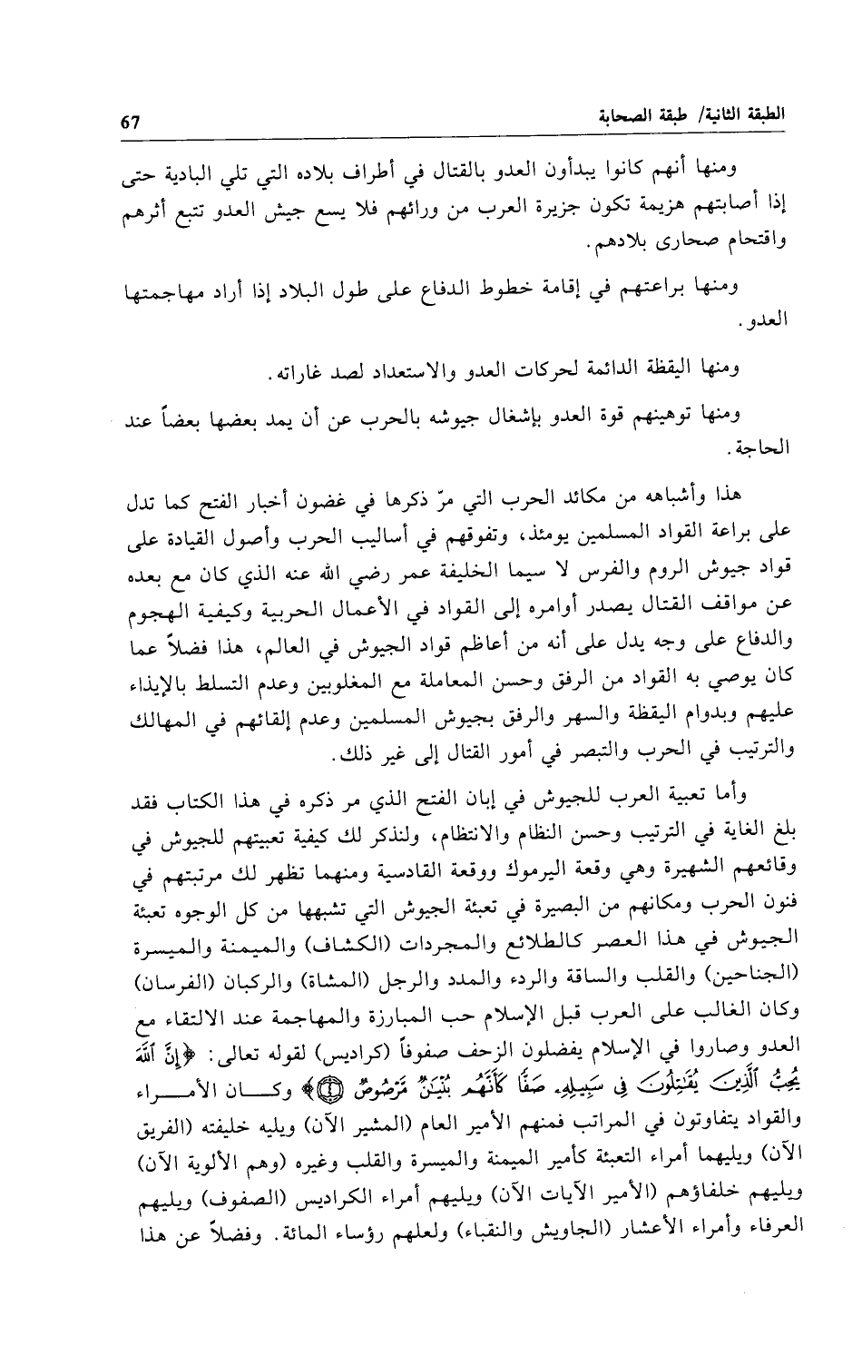 وأما تعبية العرب للجيوش في إبان الفتح الذي مر ذكره في هذا الكتاب فقد بلغ الغاية في الترتيب وحسن النظام والانتظام، ولنذكر لك كيفية تعبيتهم للجيوش في وقائعهم الشهيرة وهي وقعة اليرموك ووقعة القادسية ومنهما تظهر لك مرتبتهم في فنون الحرب ومكانهم من البصيرة في تعبئة الجيوش التي تشبهها من كل الوجوه تعبئة الجيوش في هذا العصر كالطلائع والمجردات (الكشاف) والميمنة والميسرة (الجناحين) والقلب والساقة والردء والمدد والرجل (المشاة) والركبان (الفرسان) وكان الغالب على العرب قبل الإسلام حب المبارزة والمهاجمة عند الالتقاء مع العدو وصاروا في الإسلام يفضلون الزحف صفوفاً (كراديس) لقوله تعالى: {إِنَّ اللَّهَ يُحِبُّ الَّذِينَ يُقَاتِلُونَ فِي سَبِيلِهِ صَفًّا كَأَنَّهُمْ بُنْيَانٌ مَرْصُوصٌ (4)} وكان الأمراء والقواد يتفاوتون في المراتب فمنهم الأمير العام (المشير الآن) ويليه خليفته (الفريق الآن) ويليهما أمراء التعبئة كأمير الميمنة والميسرة والقلب وغيره (وهم الألوية الآن) ويليهم خلفاؤهم (الأمير الآيات الآن) ويليهم أمراء الكراديس (الصفوف) ويليهم العرفاء وأمراء الأعشار (الجاويش والنقباء) ولعلهم رؤساء المائة. وفضلاً عن هذا
