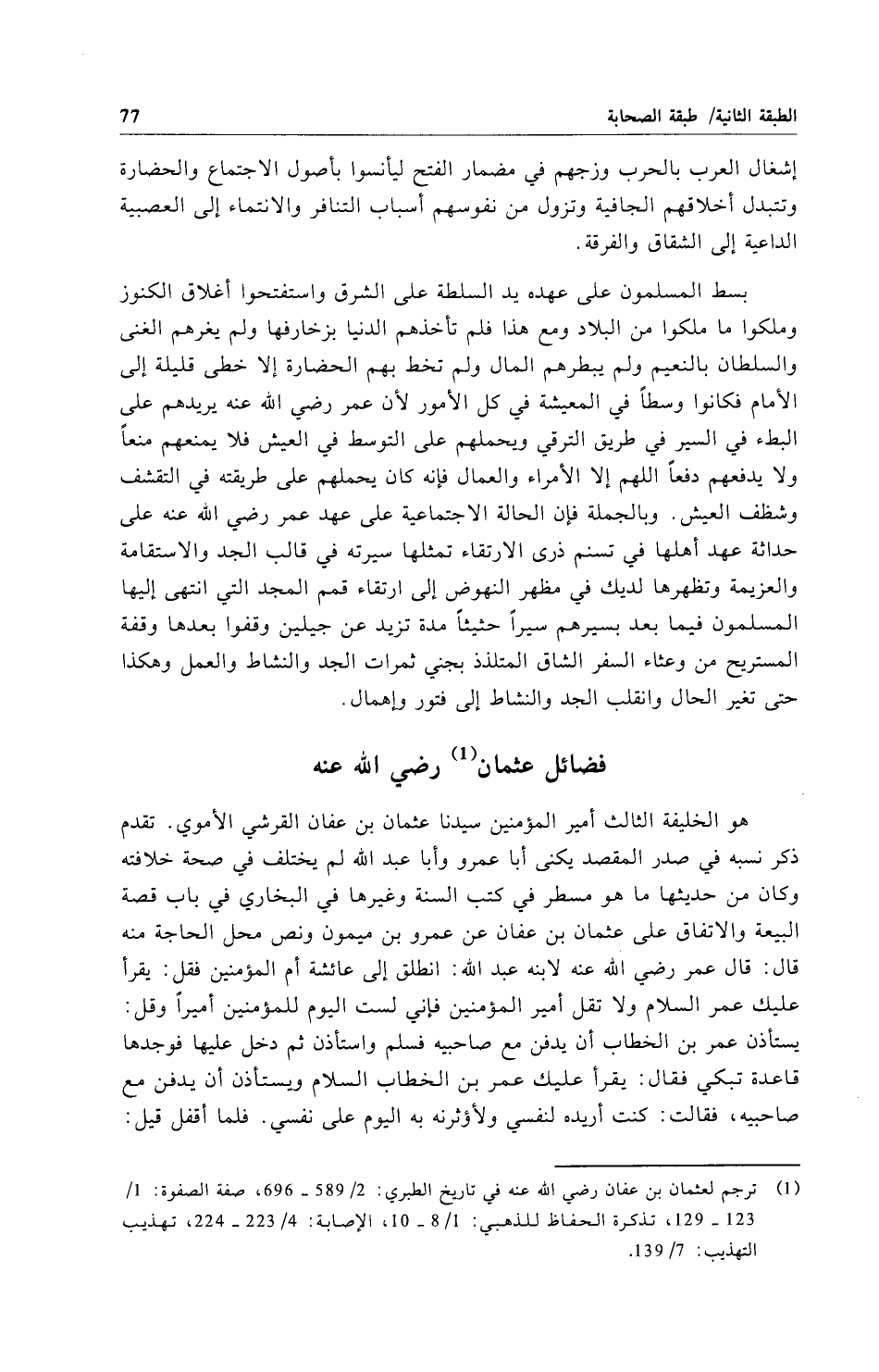 هو الخليفة الثالث أمير المؤمنين سيدنا عثمان بن عفان القرشي الأموي. تقدم ذكر نسبه في صدر المقصد يكنى أبا عمرو وأبا عبد الله لم يختلف في صحة خلافته وكان من حديثها ما هو مسطر في كتب السنة وغيرها في البخاري في باب قصة البيعة والاتفاق على عثمان بن عفان عن عمرو بن ميمون ونص محل الحاجة منه قال: قال عمر رضي الله عنه لابنه عبد الله: انطلق إلى عائشة أم المؤمنين فقل: يقرأ عليك عمر السلام ولا تقل أمير المؤمنين فإني لست اليوم للمؤمنين أميراً وقيل: يستأذن عمر بن الخطاب أن يدفن مع صاحبيه فسلم واستأذن ثم دخل عليها فوجدها قاعدة تبكي فقال: يقرأ عليك عمر بن الخطاب السلام ويستأذن أن يدفن مع صاحبيه، فقالت: كنت أريده لنفسي ولأؤثرنه به اليوم على نفسي. فلما أقفل قيل: