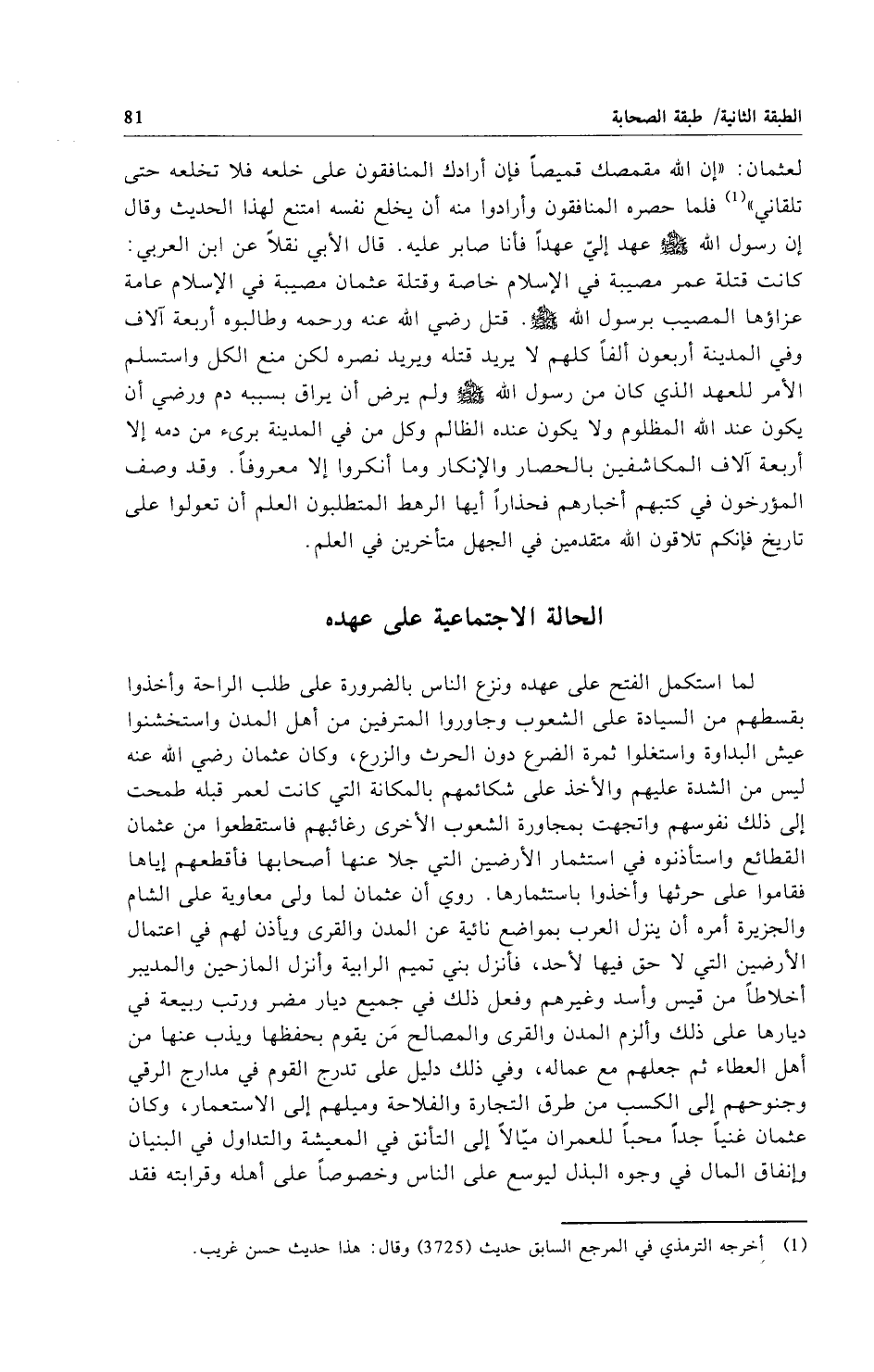 لعثمان: "إن الله مقمصك قميصاً فإن أرادك المنافقون على خلعه فلا تخلعه حتى تلقاني" فلما حصره المنافقون وأرادوا منه أن يخلع نفسه امتنع لهذا الحديث وقال إن رسول الله - صلى الله عليه وسلم - عهد إليّ عهداً فأنا صابر عليه. قال الأبي نقلاً عن ابن العربي: كانت قتلة عمر مصيبة في الإسلام خاصة وقتلة عثمان مصيبة في الإِسلام عامة عزاؤها المصيب برسول الله - صلى الله عليه وسلم -. قتل - رضي الله عنه - ورحمه وطالبوه أربعة آلاف وفي المدينة أربعون ألفاً كلهم لا يريد قتله ويريد نصره لكن منع الكل واستسلم الأمر للعهد الذي كان من رسول الله - صلى الله عليه وسلم - ولم يرض أن يراق بسببه دم ورضي أن يكون عند الله المظلوم ولا يكون عنده الظالم وكل من في المدينة برىء من دمه إلا أربعة آلاف المكاشفين بالحصار والإنكار وما أنكروا إلا معروفاً. وقد وصف المؤرخون في كتبهم أخبارهم فحذاراً أيها الرهط المتطلبون العلم أن تعولوا على تاريخ فإنكم تلاقون الله متقدمين في الجهل متأخرين في العلم.