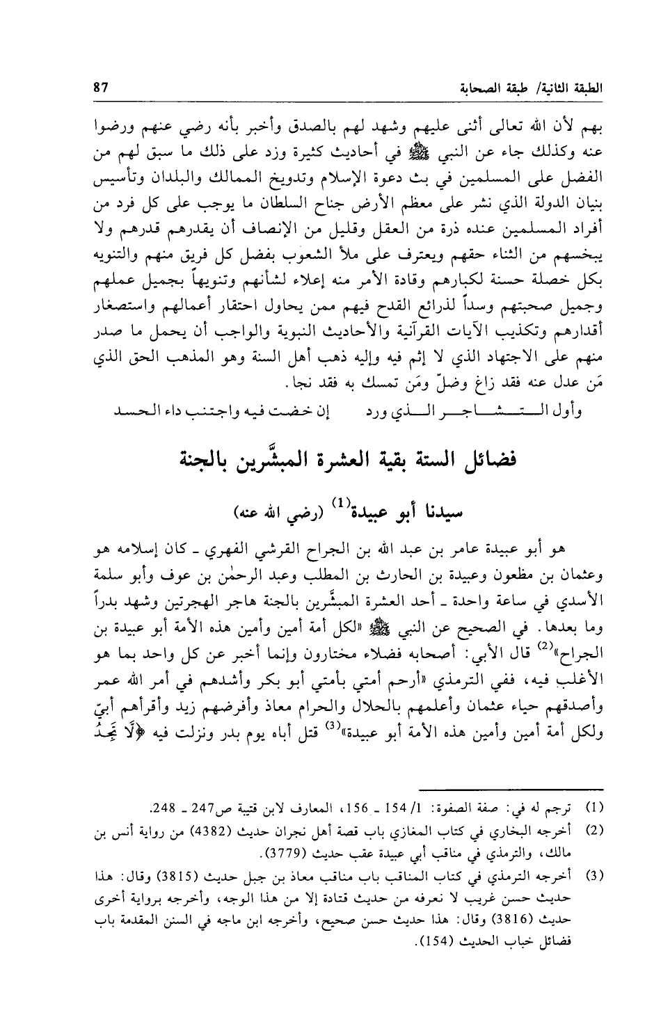 بهم لأن الله تعالى أثنى عليهم وشهد لهم بالصدق وأخبر بأنه رضي عنهم ورضوا عنه وكذلك جاء عن النبي - صلى الله عليه وسلم - في أحاديث كثيرة وزد على ذلك ما سبق لهم من الفضل على المسلمين في بث دعوة الإسلام وتدويخ الممالك والبلدان وتأسيس بنيان الدولة الذي نشر على معظم الأرض جناح السلطان ما يوجب على كل فرد من أفراد المسلمين عنده ذرة من العقل وقليل من الإنصاف أن يقدرهم قدرهم ولا يبخسهم من الثناء حقهم ويعترف على ملأ الشعوب بفضل كل فريق منهم والتنويه بكل خصلة حسنة لكبارهم وقادة الأمر منه إعلاء لشأنهم وتنويهاً بجميل عملهم وجميل صحبتهم وسداً لذرائع القدح فيهم ممن يحاول احتقار أعمالهم واستصغار أقدارهم وتكذيب الآيات القرآنية والأحاديث النبوية والواجب أن يحمل ما صدر منهم على الاجتهاد الذي لا إثم فيه وإليه ذهب أهل السنة وهو المذهب الحق الذي مَن عدل عنه فقد زاغ وضلّ ومَن تمسك به فقد نجا.