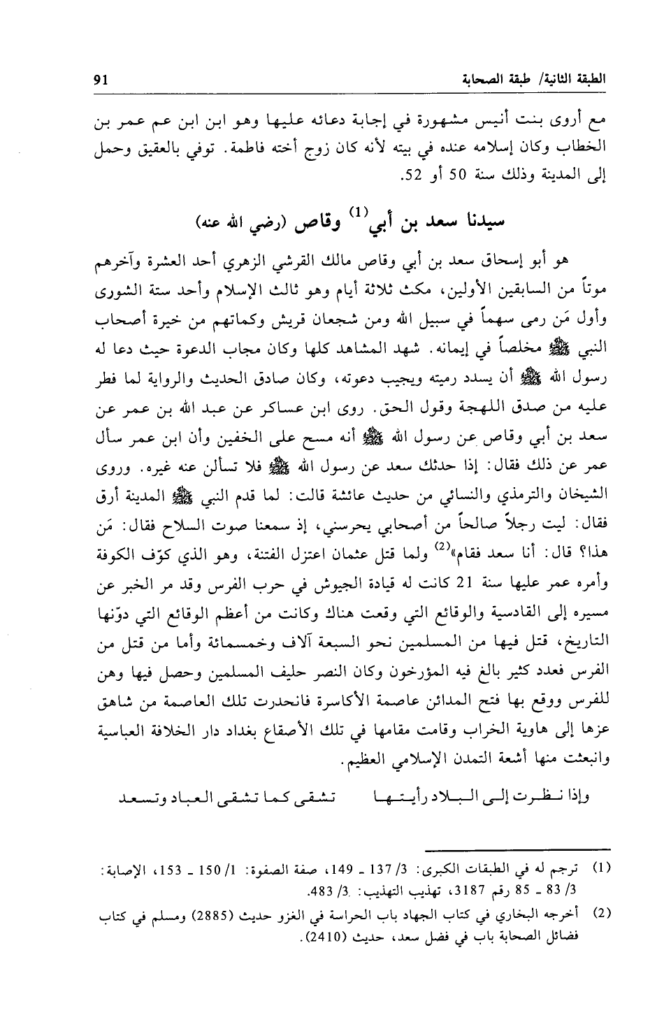 هو أبو إسحاق سعد بن أبي وقاص مالك القرشي الزهري أحد العشرة وآخرهم موتاً من السابقين الأولين، مكث ثلاثة أيام وهو ثالث الإِسلام وأحد ستة الشورى وأول مَن رمى سهماً في سبيل الله ومن شجعان قريش وكماتهم من خيرة أصحاب النبي - صلى الله عليه وسلم - مخلصاً في إيمانه. شهد المشاهد كلها وكان مجاب الدعوة حيث دعا له رسول الله - صلى الله عليه وسلم - أن يسدد رميته ويجيب دعوته، وكان صادق الحديث والرواية لما فطر عليه من صدق اللهجة وقول الحق. روى ابن عساكر عن عبد الله بن عمر عن سعد بن أبي وقاص عن رسول الله - صلى الله عليه وسلم - أنه مسح على الخفين وأن ابن عمر سأل عمر عن ذلك فقال: إذا حدثك سعد عن رسول الله - صلى الله عليه وسلم - فلا تسألن عنه غيره. وروى الشيخان والترمذي والنسائي من حديث عائشة قالت: لما قدم النبي - صلى الله عليه وسلم - المدينة أرق فقال: ليت رجلاً صالحاً من أصحابي يحرسني، إذ سمعنا صوت السلاح فقال: مَن هذا؟ قال: أنا سعد فقام" ولما قتل عثمان اعتزل الفتنة، وهو الذي كوّف الكوفة وأمره عمر عليها سنة 21 كانت له قيادة الجيوش في حرب الفرس وقد مر الخبر عن مسيره إلى القادسية والوقائع التي وقعت هناك وكانت من أعظم الوقائع التي دوّنها التاريخ, قتل فيها من المسلمين نحو السبعة آلاف وخمسمائة وأما من قتل من الفرس فعدد كثير بالغ فيه المؤرخون وكان النصر حليف المسلمين وحصل فيها وهن للفرس ووقع بها فتح المدائن عاصمة الأكاسرة فانحدرت تلك العاصمة من شاهق عزها إلى هاوية الخراب وقامت مقامها في تلك الأصقاع بغداد دار الخلافة العباسية وانبعثت منها أشعة التمدن الإِسلامي العظيم.