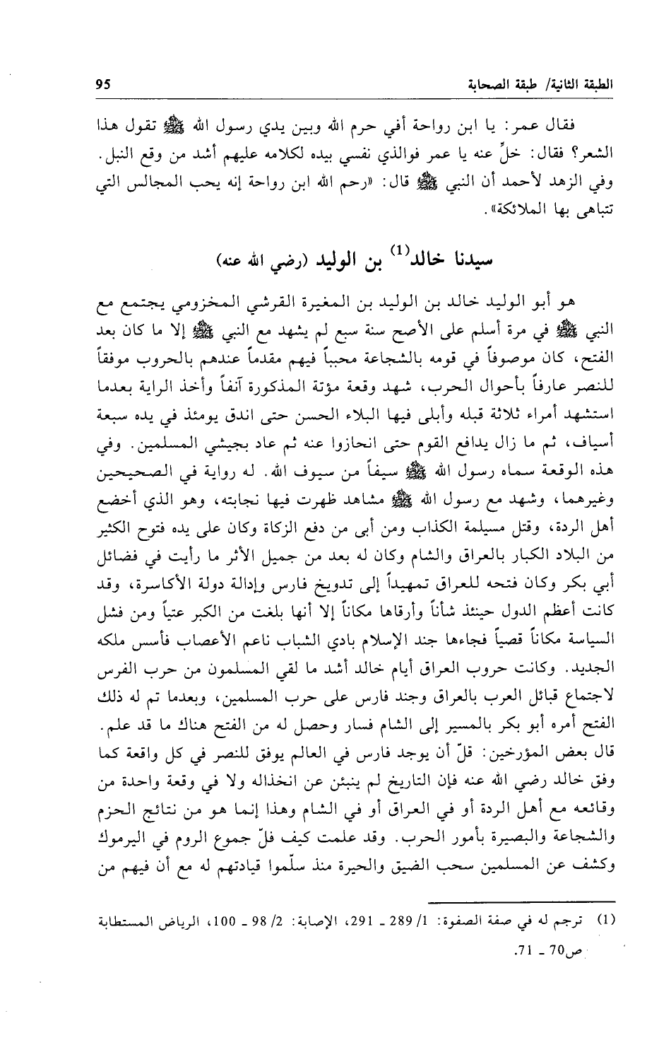 هو أبو الوليد خالد بن الوليد بن المغيرة القرشي المخزومي يجتمع مع النبي - صلى الله عليه وسلم - في مرة أسلم على الأصح سنة سبع لم يشهد مع النبي - صلى الله عليه وسلم - إلا ما كان بعد الفتح، كان موصوفاً في قومه بالشجاعة محبباً فيهم مقدماً عندهم بالحروب موفقاً للنصر عارفاً بأحوال الحرب، شهد وقعة مؤتة المذكورة آنفاً وأخذ الراية بعدما استشهد أمراء ثلاثة قبله وأبلى فيها البلاء الحسن حتى اندق يومئذ في يده سبعة أسياف، ثم ما زال يدافع القوم حتى انحازوا عنه ثم عاد بجيشي المسلمين. وفي هذه الوقعة سماه رسول الله - صلى الله عليه وسلم - سيفاً من سيوف الله. له رواية في الصحيحين وغيرهما، وشهد مع رسول الله - صلى الله عليه وسلم - مشاهد ظهرت فيها نجابته، وهو الذي أخضع أهل الردة، وقتل مسيلمة الكذاب ومن أبى من دفع الزكاة وكان على يده فتوح الكثير من البلاد الكبار بالعراق والشام وكان له بعد من جميل الأثر ما رأيت في فضائل أبي بكر وكان فتحه للعراق تمهيداً إلى تدويخ فارس وإدالة دولة الأكاسرة، وقد كانت أعظم الدول حينئذ شأناً وأرقاها مكاناً إلا أنها بلغت من الكبر عتياً ومن فشل السياسة مكاناً قصياً فجاءها جند الإِسلام بادي الشباب ناعم الأعصاب فأسس ملكه الجديد. وكانت حروب العراق أيام خالد أشد ما لقي المسلمون من حرب الفرس لاجتماع قبائل العرب بالعراق وجند فارس على حرب المسلمين، وبعدما تم له ذلك الفتح أمره أبو بكر بالمسير إلى الشام فسار وحصل له من الفتح هناك ما قد علم. قال بعض المؤرخين: قلّ أن يوجد فارس في العالم يوفق للنصر في كل واقعة كما وفق خالد رضي الله عنه فإن التاريخ لم ينبئن عن انخذاله ولا في وقعة واحدة من وقائعه مع أهل الردة أو في العراق أو في الشام وهذا إنما هو من نتائج الحزم والشجاعة والبصيرة بأمور الحرب. وقد علمت كيف فلّ جموع الروم في اليرموك وكشف عن المسلمين سحب الضيق والحيرة منذ سلّموا قيادتهم له مع أن فيهم من