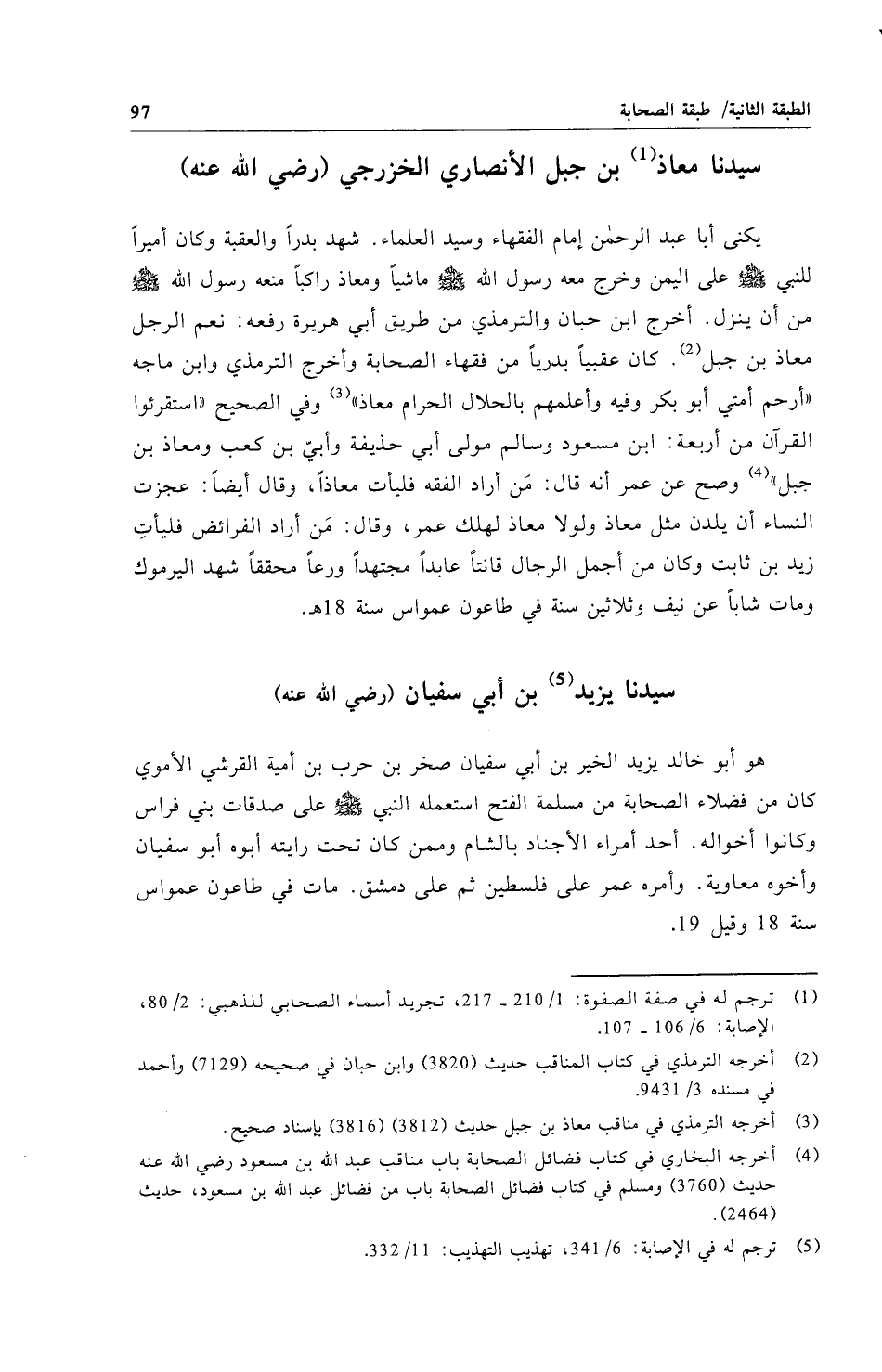 يكنى أبا عبد الرحمن إمام الفقهاء وسيد العلماء. شهد بدراً والعقبة وكان أميراً للنبي - صلى الله عليه وسلم - على اليمن وخرج معه رسول الله - صلى الله عليه وسلم - ماشياً ومعاذ راكباً منعه رسول الله - صلى الله عليه وسلم - من أن ينزل. أخرج ابن حبان والترمذي من طريق أبي هريرة رفعه: نعم الرجل معاذ بن جبل. كان عقبياً بدرياً من فقهاء الصحابة وأخرج الترمذي وابن ماجه "أرحم أمتي أبو بكر وفيه وأعلمهم بالحلال الحرام معاذ" وفي الصحيح "استقرئوا القرآن من أربعة: ابن مسعود وسالم مولى أبي حذيفة وأبيّ بن كعب ومعاذ بن جبل" وصح عن عمر أنه قال: مَن أراد الفقه فليأت معاذاً، وقال أيضاً: عجزت النساء أن يلدن مثل معاذ ولولا معاذ لهلك عمر، وقال: مَن أراد الفرائض فليأتِ زيد بن ثابت وكان من أجمل الرجال قانتاً عابداً مجتهداً ورعاً محققاً شهد اليرموك ومات شاباً عن نيف وثلاثين سنة في طاعون عمواس سنة 18هـ.