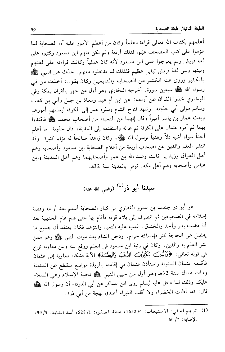 هو أبو ذر جندب بن عمرو الغفاري من كبار الصحابة أسلم بعد أربعة وقصة إسلامه في الصحيحين ثم انصرف إلى بلاد قومه فأقام بها حتى قدم عام الحديبية بعد أن مضت بدر وأحد والخندق. غلب عليه التعبد والتزهد فكان يعتقد أن جميع ما يفضل عن الحاجة كنز فإمساكه حرام، ودخل الشام بعد موت النبي - صلى الله عليه وسلم - وهو ممن نشر العلم به والدين، وكان في رتبة ابن مسعود في العلم ووقع بينه وبين معاوية نزاع في قوله تعالى: {وَالَّذِينَ يَكْنِزُونَ الذَّهَبَ وَالْفِضَّةَ} الآية فشكاه معاوية إلى عثمان فأقدمه عثمان المدينة واستأذن عثمان في إقامته بالربذة موضع منقطع عن المدينة ومات هناك سنة 32 هـ وهو أول من حيى النبي - صلى الله عليه وسلم - تحية الإِسلام وهي السلام عليكم وذلك لما دخل عليه ليسلم روى ابن عساكر عن أبي الدرداء أن رسول الله - صلى الله عليه وسلم - قال: "ما أظلت الخضراء ولا أقلت الغبراء أصدق لهجة من أبي ذر".