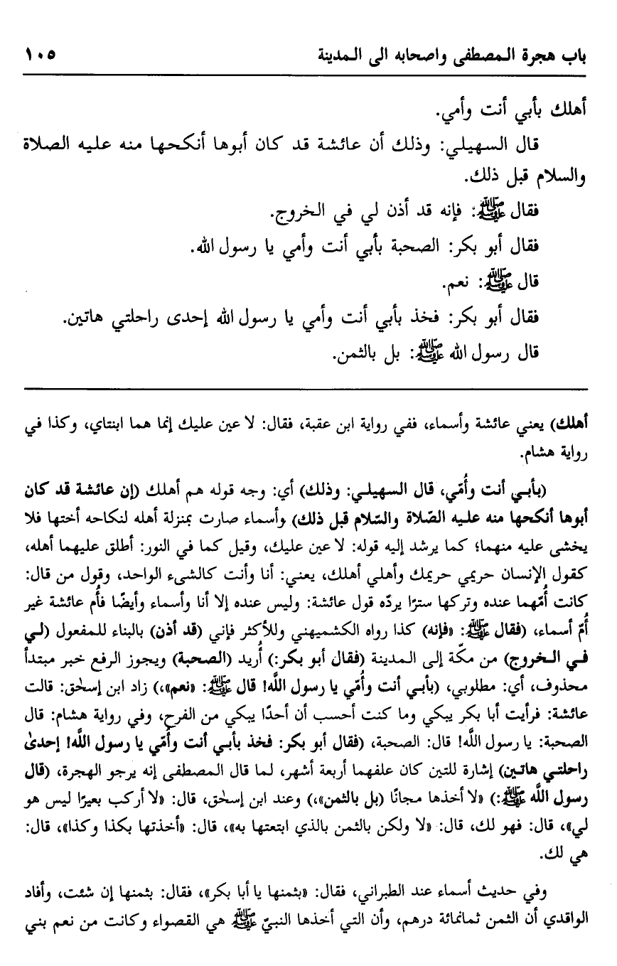"بأبي أنت وأمي، قال السهيلي: وذلك" أي: وجه قوله هم أهلك "إن عائشة قد كان أبوها أنكحها منه عليه الصلاة والسلام قبل ذلك" وأسماء صارت بمنزلة أهله لنكاحه أختها فلا يخشى عليه منهما؛ كما يرشد إليه قوله: لا عين عليك، وقيل كما في النور: أطلق عليهما أهله، كقول الإنسان حريمي حريمك وأهلي أهلك، يعني: أنا وأنت كالشيء الواحد، وقول من قال كانت أمهما عنده وتركها سترا يرده قول عائشة: وليس عنده إلا أنا وأسماء وأيضا فأم عائشة غير أم أسماء، "فقال -صلى الله عليه وسلم: "فإنه" كذا رواه الكشميهني وللأكثر فإني "قد أذن" بالبناء للمفعول "لي في الخروج" من مكة إلى المدينة "فقال أبو بكر" أريد "الصحبة" ويجوز الرفع خبر مبتدأ محذوف، أي: مطلوبي، "بأبي أنت وأمي يا رسول الله! قال -صلى الله عليه وسلم: "نعم"، زاد ابن إسحاق: قالت عائشة: فرأيت أبا بكر يبكي وما كنت أحسب أن أحدا يبكي من الفرح، وفي رواية هشام: قال الصحبة: يا رسول الله! قال: "الصحبة"، "فقال أبو بكر: فخذ بأبي أنت وأمي يا رسول الله! إحدى راحلتي هاتين" إشارة للتين كان علفهما أربعة أسهر، لما قال المصطفى إنه يرجو الهجرة، "قال رسول الله -صلى الله عليه وسلم": لا أخذها مجانا "بل بالثمن"، وعند ابن إسحاق، قال: "لا أركب بعيرا ليس هو لي"، قال: هو لك، قال: "لا ولكن بالثمن بالذي ابتعتها به"، قال: "أخذتها بكذا وكذا"، قال: هي لك.