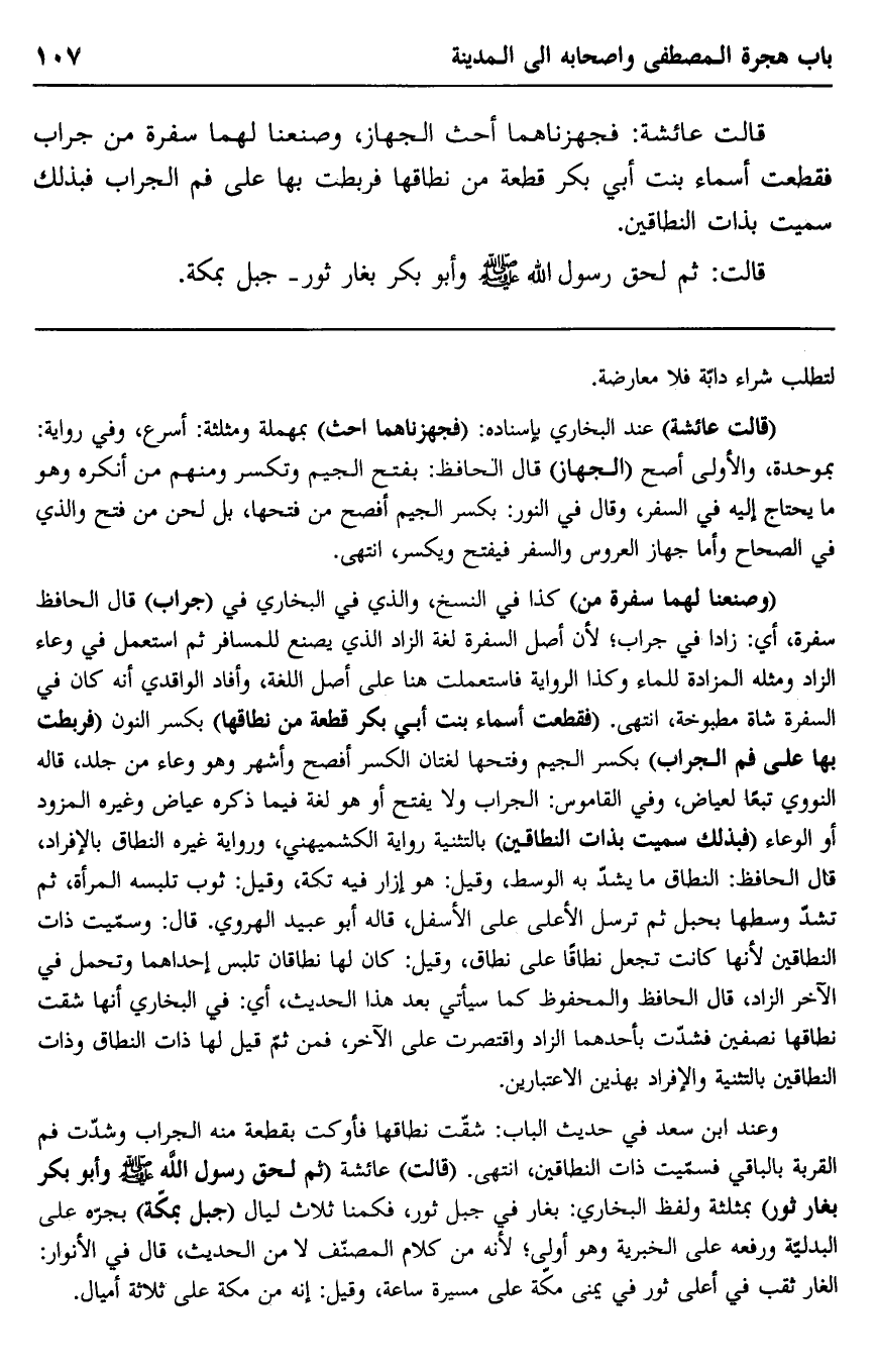 "وصنعنا لهما سفرة من" كذا في النسخ، والذي في البخاري في "جراب" قال الحافظ سفرة، أي: زادا في جراب؛ لأن أصل السفرة لغة الزاد الذي يصنع للمسافر ثم استعمل في وعاء الزاد ومثله المزادة للماء وكذا الرواية فاستعملت هنا على أصل اللغة، وأفاد الواقدي أنه كان في السفرة شاة مطبوخة، انتهى. "فقطعت أسماء بنت أبي بكر قطعة من نطاقها" بكسر النون "فربطت بها على فم الجراب" بكسر الجيم وفتحها لغتان الكسر أفصح وأشهر وهو وعاء من جلد، قاله النووي تبعا لعياض، وفي القاموس: الجراب ولا يفتح أو هو لغة فيما ذكره عياض وغيره المزود أو الوعاء "فبذلك سميت بذات النطاقين" بالتثنية رواية الكشميهني، ورواية غيره النطاق بالإفراد، قال الحافظ: النطاق ما يشد به الوسط، وقيل: هو إزار فيه تكة، وقيل: ثوب تلبسه المرأة، ثم تشد وسطها بحبل ثم ترسل الأعلى على الأسفل، قاله أبو عبيد الهروي. قال: وسميت ذات النطاقين لأنها كانت تجعل نطاقا على نطاق، وقيل: كان لها نطاقان تلبس إحداهما وتحمل في الآخر الزاد، قال الحافظ والمحفوظ كما سيأتي بعد هذا الحديث، أي: في البخاري أنها شقت نطاقها نصفين فشدت بأحدهما الزاد واقتصرت على الآخر، فمن ثم قيل لها ذات النطاق وذات النطاقين بالثنية والإفراد بهذين الاعتبارين.