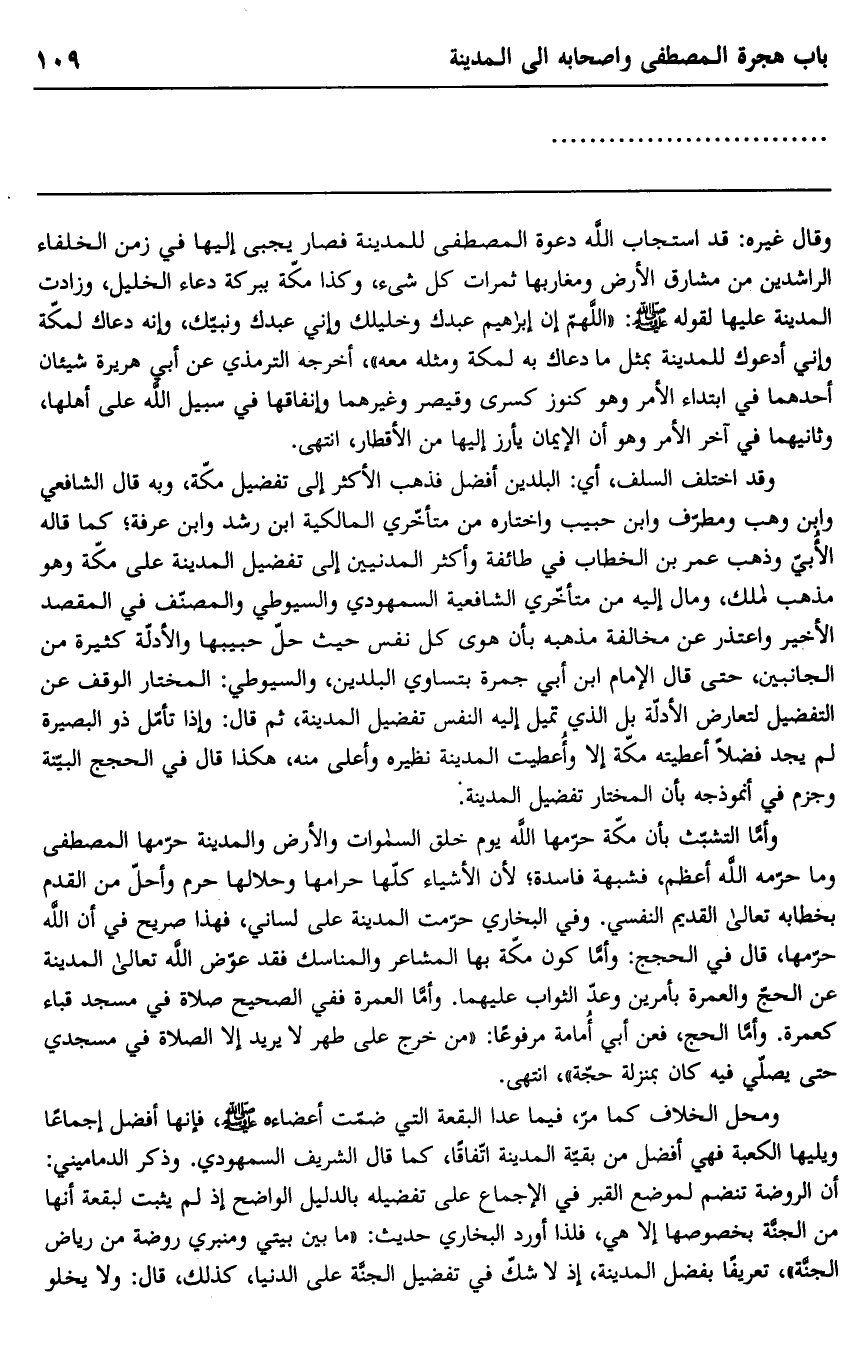 وأما التشبث بأن مكة حرمها الله يوم خلق السماوات والأرض والمدينة حرمها المصطفى وما حرمه الله أعظم، فشبهة فاسدة؛ لأن الأشياء كلها حرامها وحلالها حرم وأحل من القدم بخطابه تعالى القديم النفسي. وفي البخاري حرمت المدينة على لساني، فهذا صريح في أن الله حرمها، قال في الحجج: وأما كون مكة بها المشاعر والمناسك فقد عوض الله تعالى المدينة عن الحج والعمرة بأمرين وعد الثواب عليهما. وأما العمرة ففي الصحيح "صلاة في مسجد قباء كعمرة". وأما الحج، فعن أبي أمامة مرفوعا: "من خرج على طهر لا يريد إلا الصلاة في مسجدي حتى يصلي فيه كان بمنزلة حجة"، انتهى.