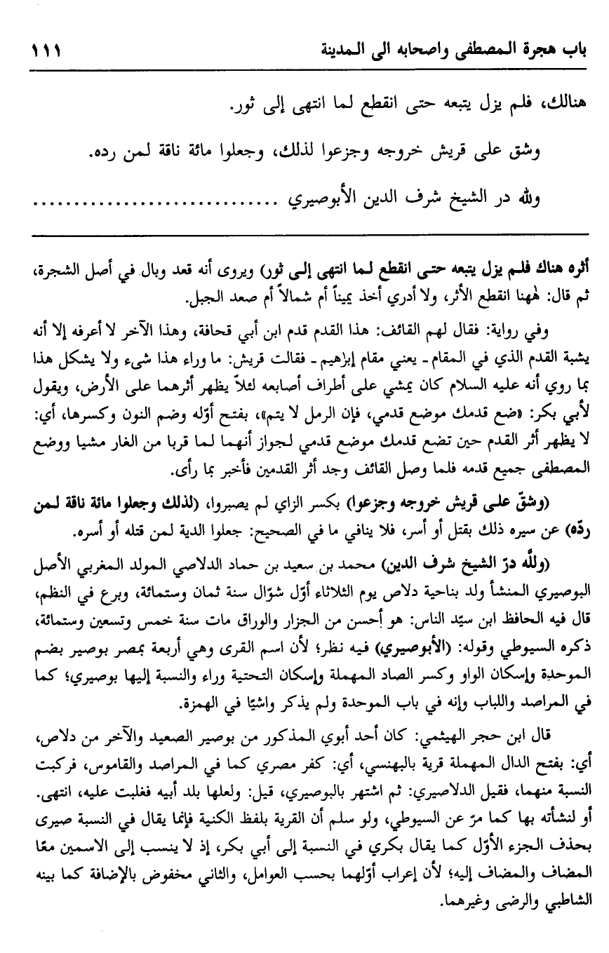 "ولله در الشيخ شرف الدين" محمد بن سعيد بن حماد الدلاصي المولد المغربي الأصل البوصيري المنشأ ولد بناحية دلاص يوم الثلاثاء أول شوال سنة ثمان وستمائة، وبرع في النظم، قال فيه الحافظ ابن سيد الناس: هو أحسن من الجزار والوراق مات سنة خمس وتسعين وستمائة، ذكره السيوطي وقوله: "الأبوصيري" فيه نظر؛ لأن اسم القرى وهي أربعة بمصر بوصير بضم الموحدة وإسكان الواو وكسر الصاد المهملة وإسكان التحتية وراء والنسبة إليها بوصيري؛ كما في المراصد واللباب وإنه في باب الموحدة ولم يذكر واشيا في الهمزة.