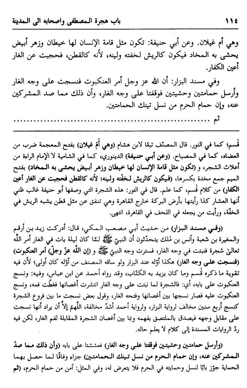 قاسم؛ كما في النور. قال المصنف تبعا لابن هشام "وهي أم غيلان" بفتح المعجمة ضرب من العضاه، كما في المصباح. "وعن أبي حنيفة" الدينوري، كما في الشامية لا الإمام الراءة من أعلاث الشجر، و"تكون مثل قامة الإنسان لها خيطان وزهر أبيض يحشى به المخاد" بفتح الميم جمع مخدة بكسرها، "فيكون كالريش لخفته ولينه؛ لأنه كالقطن فحجبت عن الغار أعين الكفار" من كلام قاسم، كما علم. قال في النور: هذه الشجرة التي وصفها أبو حنيفة غالب ظني أنها العشار كذا رأيتها بأرض البركة خارج القاهرة وهي تنفق عن مثل قطن يشبه الريش في الخفة، ورأيت من يجعله في اللحف في القاهرة، انتهى.