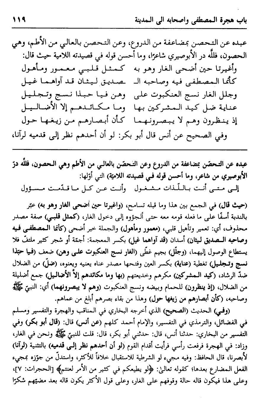 عبده عن التحصن بمضاعفة من الدروع وعن التحصن بالعالي من الأطم وهي الحصون، فلله در الأبوصيري من شاعر، وما أحسن قوله في قصيدته اللامية" التي أولها: