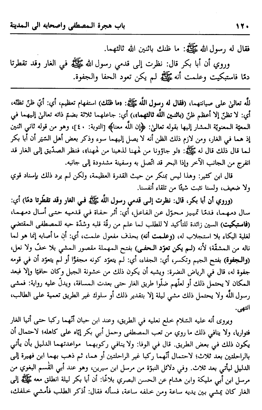 "وروي أن أبا بكر، قال: نظرت إلى قدمي رسول الله -صلى الله عليه وسلم- في الغار وقد تقطرتا دما" أي: سال دمهما، فدما تمييز محول عن الفاعل، أي: أثر حفاة في قدميه حتى أسال دمهما، "فاستبكيت" اسين زائدة للتأكيد لا للطلب لما علم من رقة قلبه وشدة حبه للمصطفى المقتضي لغلبة البكاء بلا استجلاب له، "وعلمت أنه" بحذف مفعول علمت، أي: أن ما أصابه إنما هو لما ناله من المشقة؛ لأنه "لم يكن تعود الحفى" بفتح المهملة مقصور المشي بلا خف ولا نعل، "والجفوة" بفتح الجيم وتكسر، أي: الجفاء، أي: لم يتعود كونه مجفوا أو لم يتعود أن قومه جفوة له، قال في الرياض النضرة: ويشبه أن يكون ذلك من خشونة الجبل وكان حافيا وإلا فبعد المكان لا يحتمل ذلك أو لعلهم ضلوا طريق الغار حتى بعدت المسافة، ويدل عليه رواية: فمشى رسول الله ولا يحتمل ذلك مشي ليلة إلا بتقدير ذلك أو سلوك غير الطريق تعمية على الطالب، انتهى.