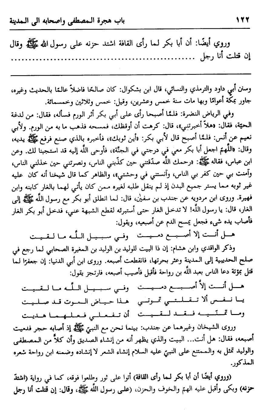 وروى الشيخان وغيرهما عن جندب: بينما نحن مع النبي -صلى الله عليه وسلم- إذ أصابه حجر فدميت أصبعه، فقال: هل أنت.. البيت والذي يظهر أنه من إنشاء الصديق وأن كلا من المصطفى والوليد تمثل به والممتنع على النبي عليه السلام إنشاء الشعر لا إنشاده وضمنه ابن رواحة شعره المذكور.