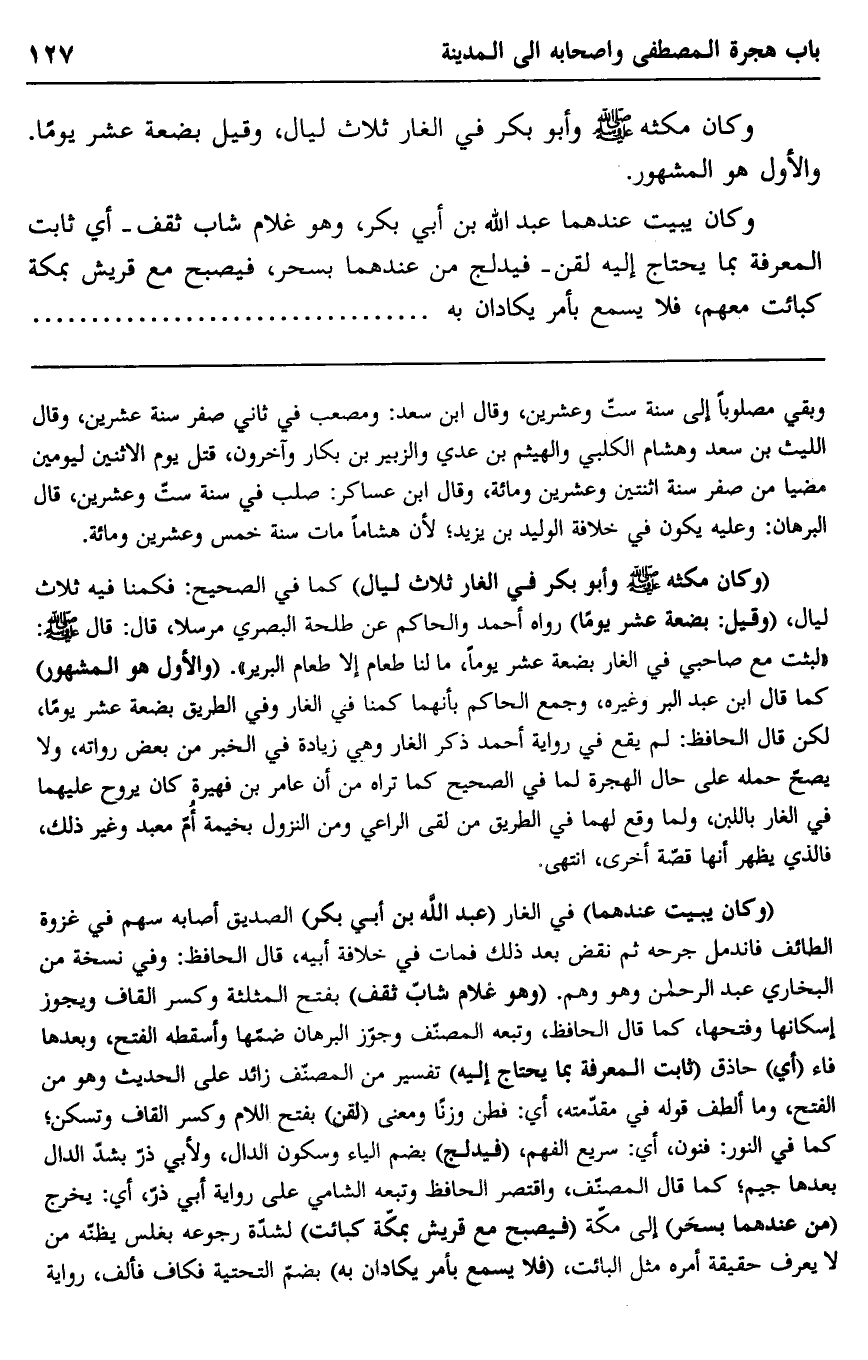"وكان مكثه -صلى الله عليه وسلم- وأبو بكر في الغار ثلاث ليال" كما في الصحيح: فكمنا فيه ثلاث ليال، "وقيل: بضعة عشر يوما" رواه أحمد والحاكم عن طلحة البصري مرسلا، قال: قال -صلى الله عليه وسلم: "لبثت مع صاحبي في الغار بضعة عشر يوما، ما لنا طعام إلا طعام البرير". "والأول هو المشهور" كما قال ابن عبد البر وغيره، وجمع الحاكم بأنهما كمنا في الغار وفي الطريق بضعة عشر يوما، لكن قال الحافظ: لم يقع في رواية أحمد ذكر الغار وهي زيادة في الخبر من بعض رواته، ولا يصح حمله على حال الهجرة لما في الصحيح كما تراه من أن عامر بن فهيرة كان يروح عليهما في الغار باللبن، ولما وقع لهما في الطريق من لقي الراعي ومن النزول بخيمة أم معبد وغير ذلك، فالذي يظهر أنها قصة أخرى، انتهى.