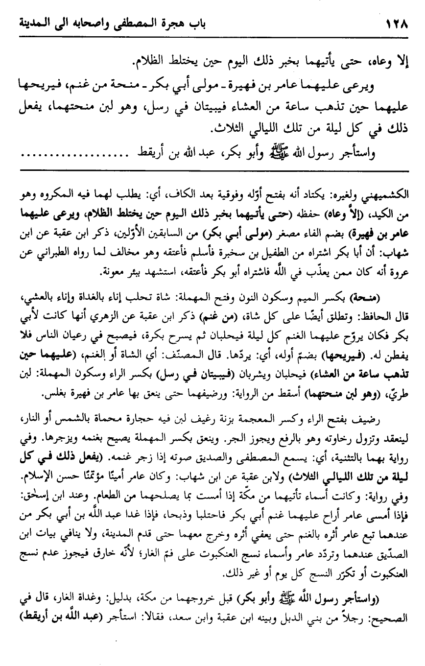 ويرعى عليهما عامر بن فهيرة -مولى أبي بكر- منحة من غنم، فيريحها عليهما حين تذهب ساعة من العشاء فيبيتان في رسل، وهو لبن منحتهما، يفعل ذلك في كل ليلة من تلك الليالي الثلاث.