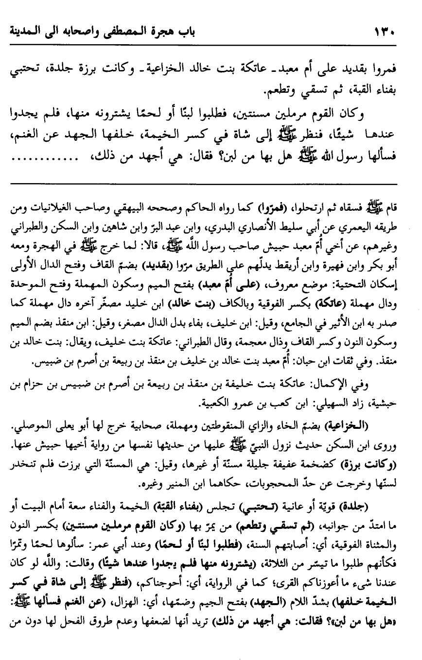 قام -صلى الله عليه وسلم- فسقاه ثم ارتحلوا، "فمروا" كما رواه الحاكم وصححه البيهقي وصاحب الغيلانيات ومن طريقه اليعمري عن أبي سليط الأنصاري البدري، وابن عبد البر وابن شاهين وابن السكن والطبراني وغيرهم، عن أخي أم معبد حبيش صاحب رسول الله -صلى الله عليه وسلم، قالا: لما خرج -صلى الله عليه وسلم- في الهجرة ومعه أبو بكر وابن فهيرة وابن أريقط يدلهم على الطريق مروا "بقديد" بضم القاف وفتح الدال الأولى إسكان التحتية: موضع معروف، "على أم معبد" بفتح الميم وسكون المهملة وفتح الموحدة ودال مهملة "عاتكة" بكسر الفوقية وبالكاف "بنت خالد" ابن خليد مصغر آخره دال مهملة كما صدر به ابن الأثير في الجامع، وقيل: ابن خليف، بفاء بدل الدال مصغر وقيل: ابن منقذ بضم الميم وسكون النون وكسر القاف وذال معجمة وقال الطبراني: عاتكة بنت خليف، وقال: بنت خالد بن منقذ. وفي ثقات ابن حبان: أم معبد بنت خالد بن خليف بن منقذ بن ربيعة بن أصرم بن ضبيس.